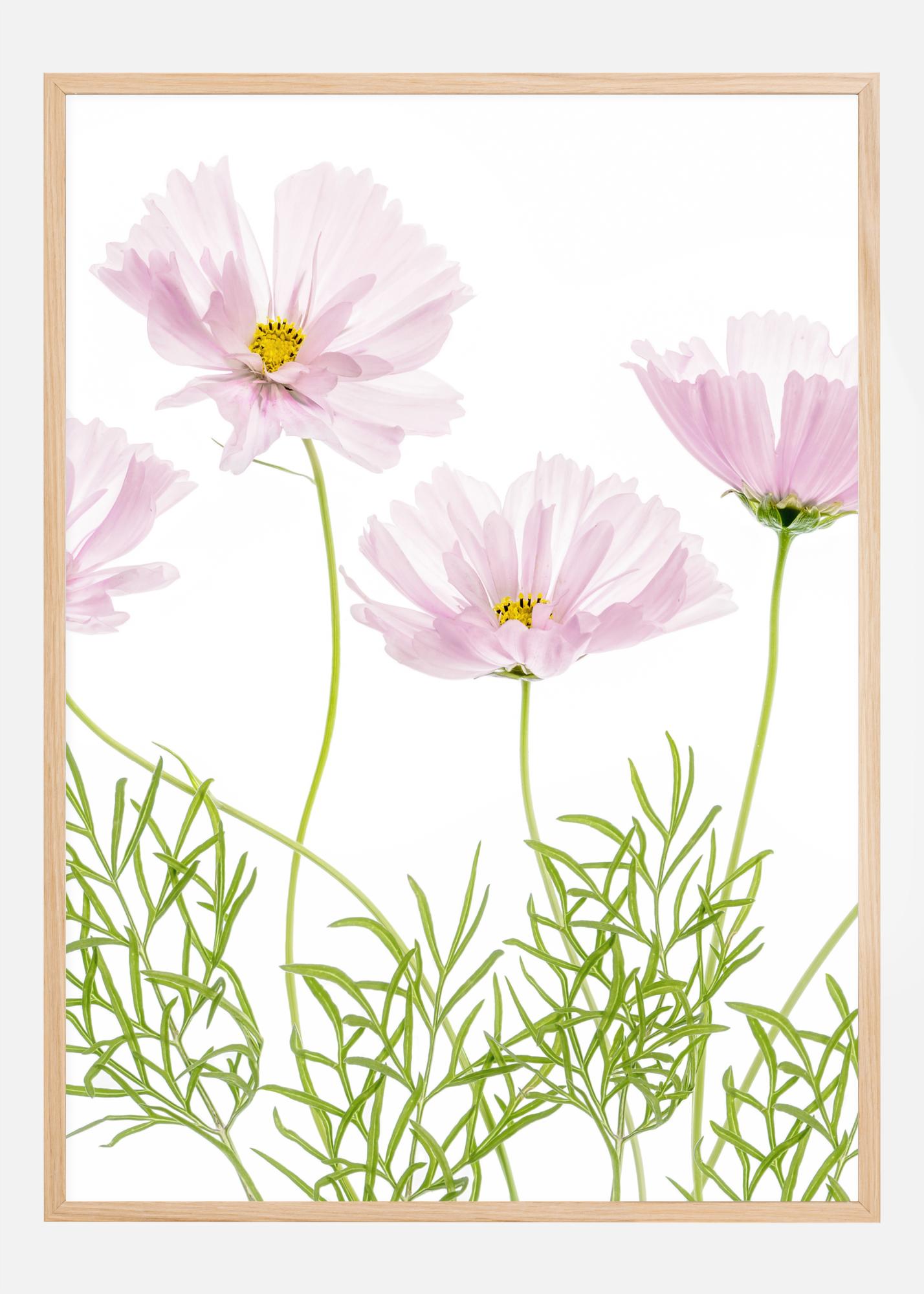 Plakát v tiskovém stylu s kosatci. Každá květina je jemně fialově-růžová se světle žlutým středem. Jednoduché zelené listy vedou pohled k těmto tančícím květinám. Získejte rozmarný pocit pomocí tohoto úžasného tisku ve svém domově.