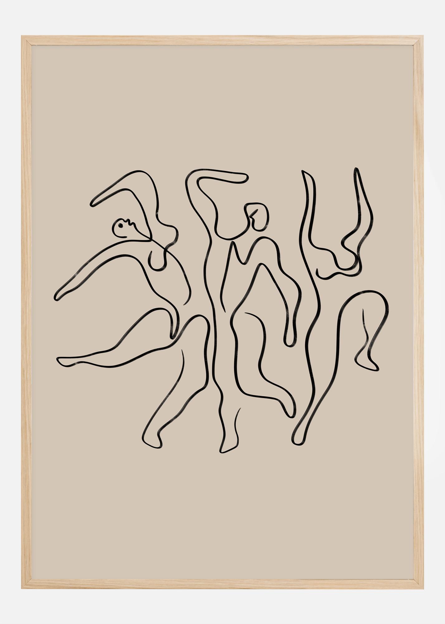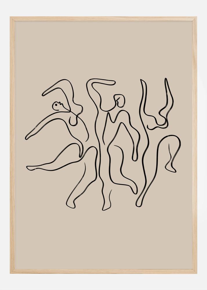 Tento umělecký plakát představuje sérii abstraktních postav, které svými plynulými liniemi vyvolávají pocit pohybu a tance. Jednoduchá, ale výrazná ilustrace v černé barvě proti klidnému béžovému pozadí nabízí minimalistický, ale živý výraz. Tento typ motivu je ideální pro ty, kteří ocení nenápadná, ale silná umělecká díla, která inspirují k pohybu a svobodě.