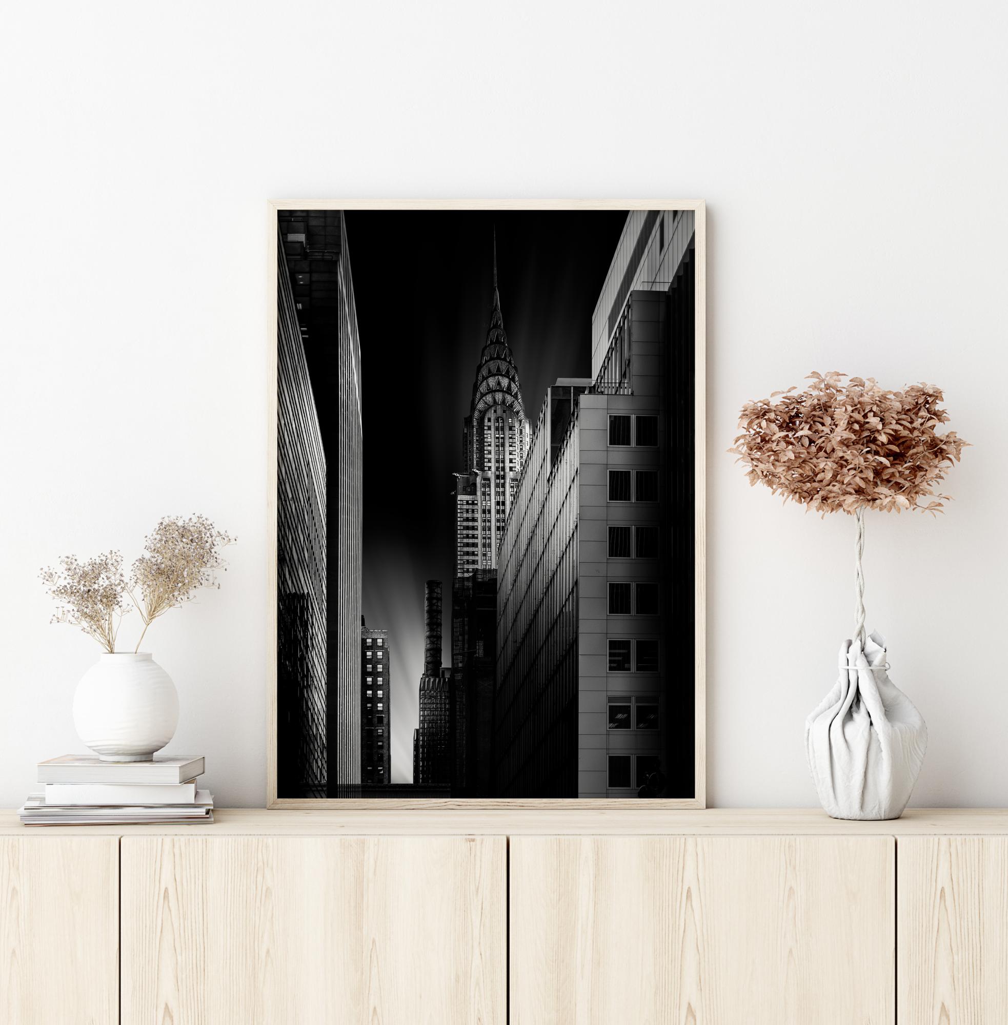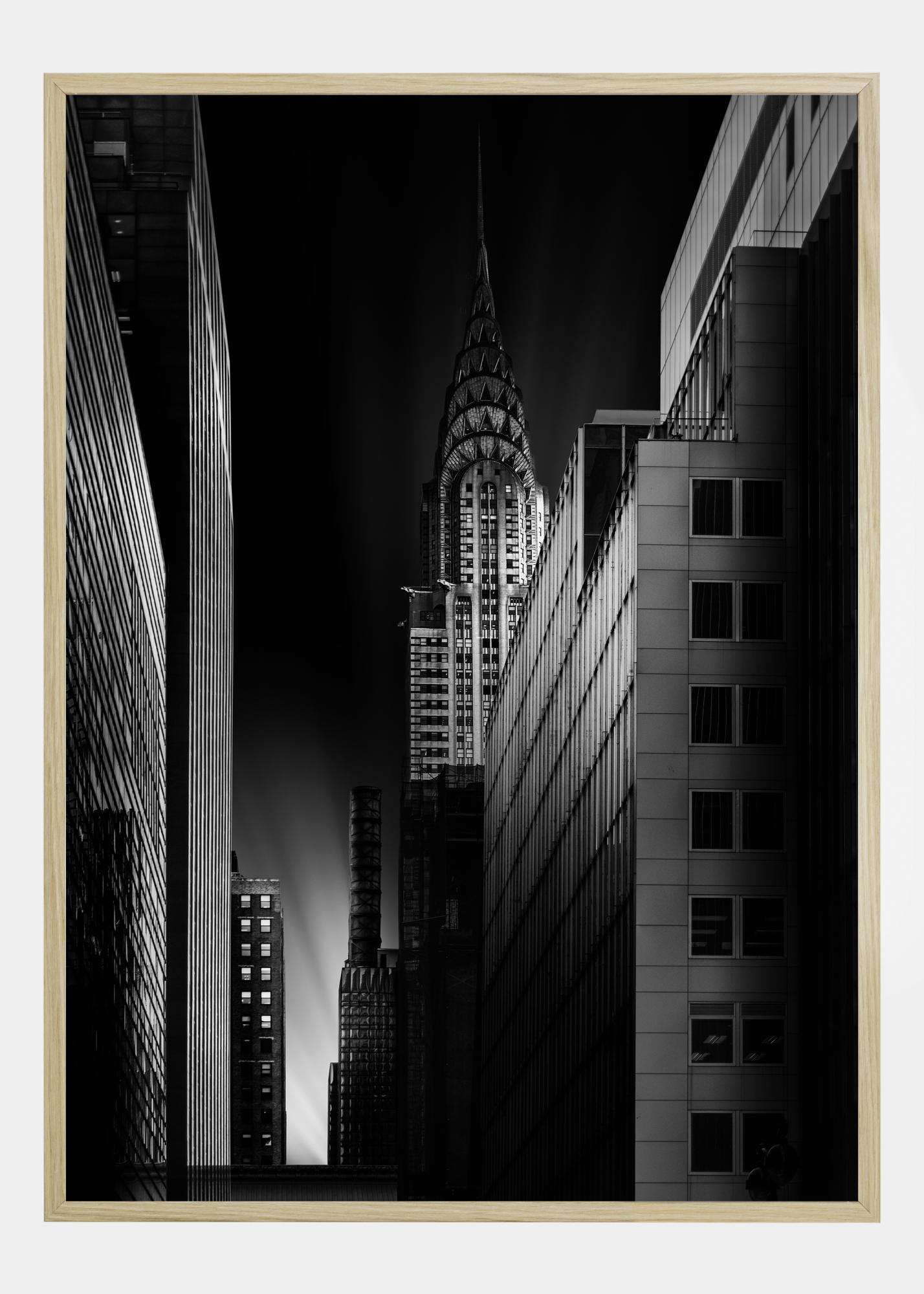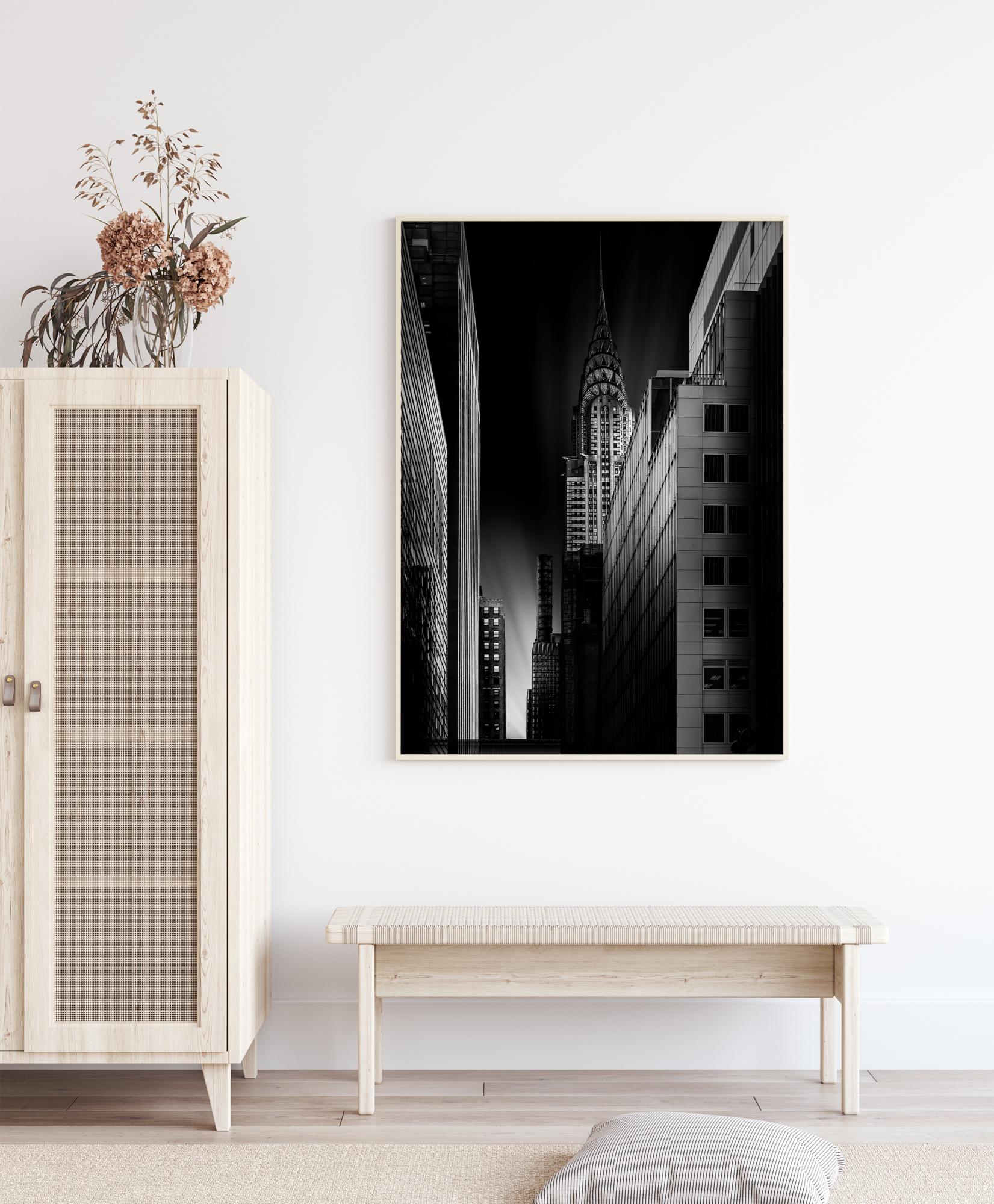 Urbanistický plakát s Chryslerovou budovou v noci. Úzká ulice vede pohled dolů k záblesku světla na obloze. Vpravo lze vidět stinnou budovu na této poněkud strašidelné fotografii. Zavěšený obraz na bílé stěně v soukromé galerii.