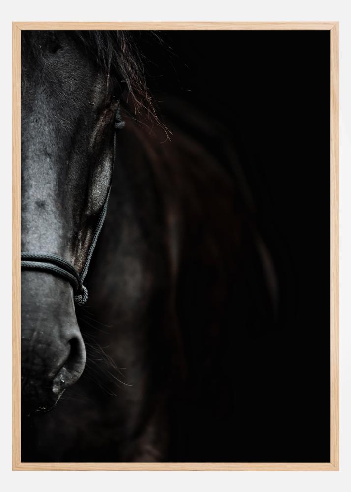 Fotografický plakát pro milovníky koní! Zde je tmavý kůň vyfocený přímo zepředu na tmavém pozadí. Obličej je krásně osvětlen, zatímco zadní části koně splývají s pozadím. Doporučujeme doplnit něčím z naší široké nabídky rámů.