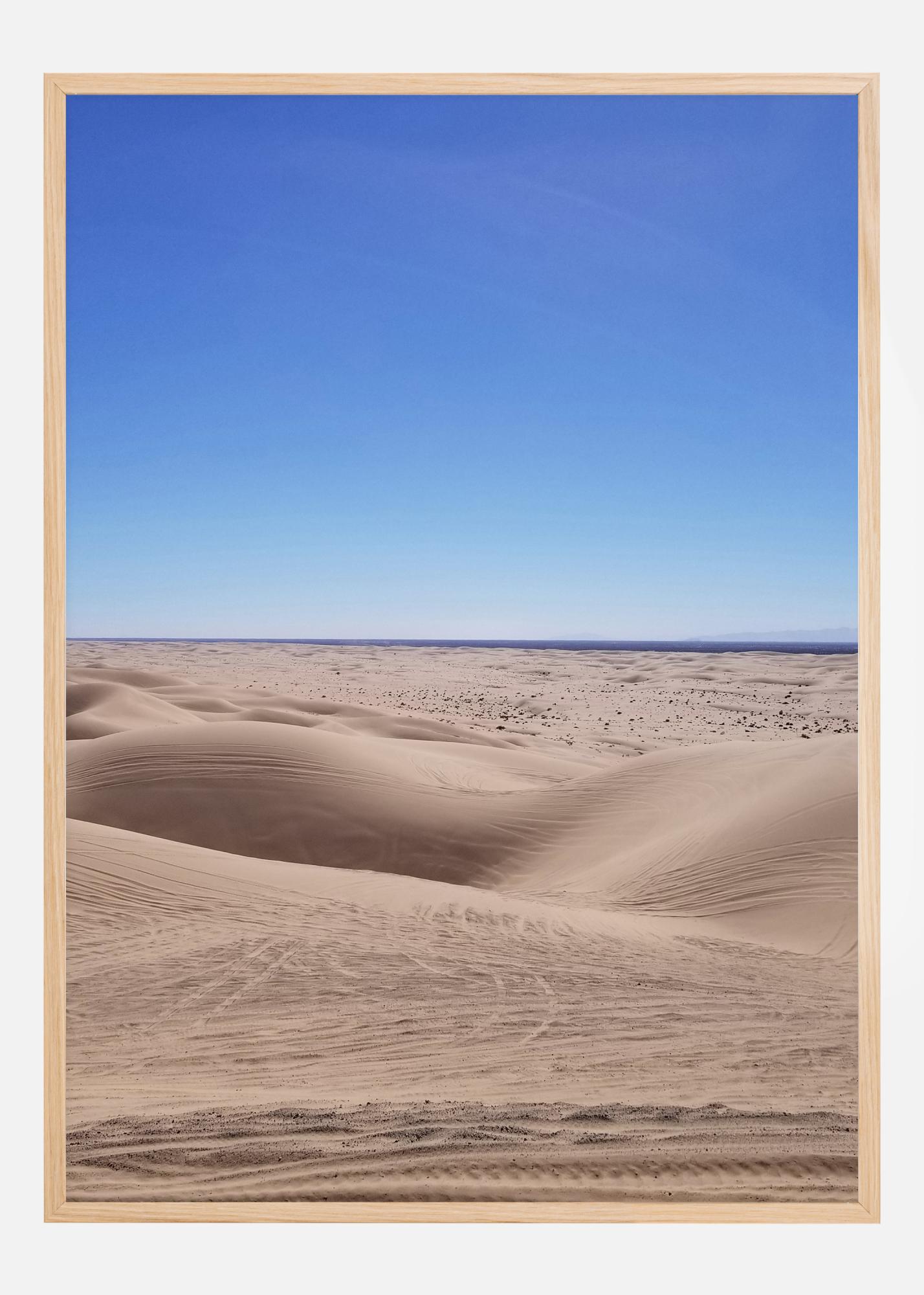 Atmosférický plakát s pouštní krajinou. Hluboká červená poušť zvýrazňuje vlnící se písečné duny, které vedou pohled krajinou. Jemně modrá obloha a mlhavé růžové odstíny dodávají pocit brzkého rána. Užijte si rozlehlé prostory přírody, když máte tento obraz pověšený na stěně.
