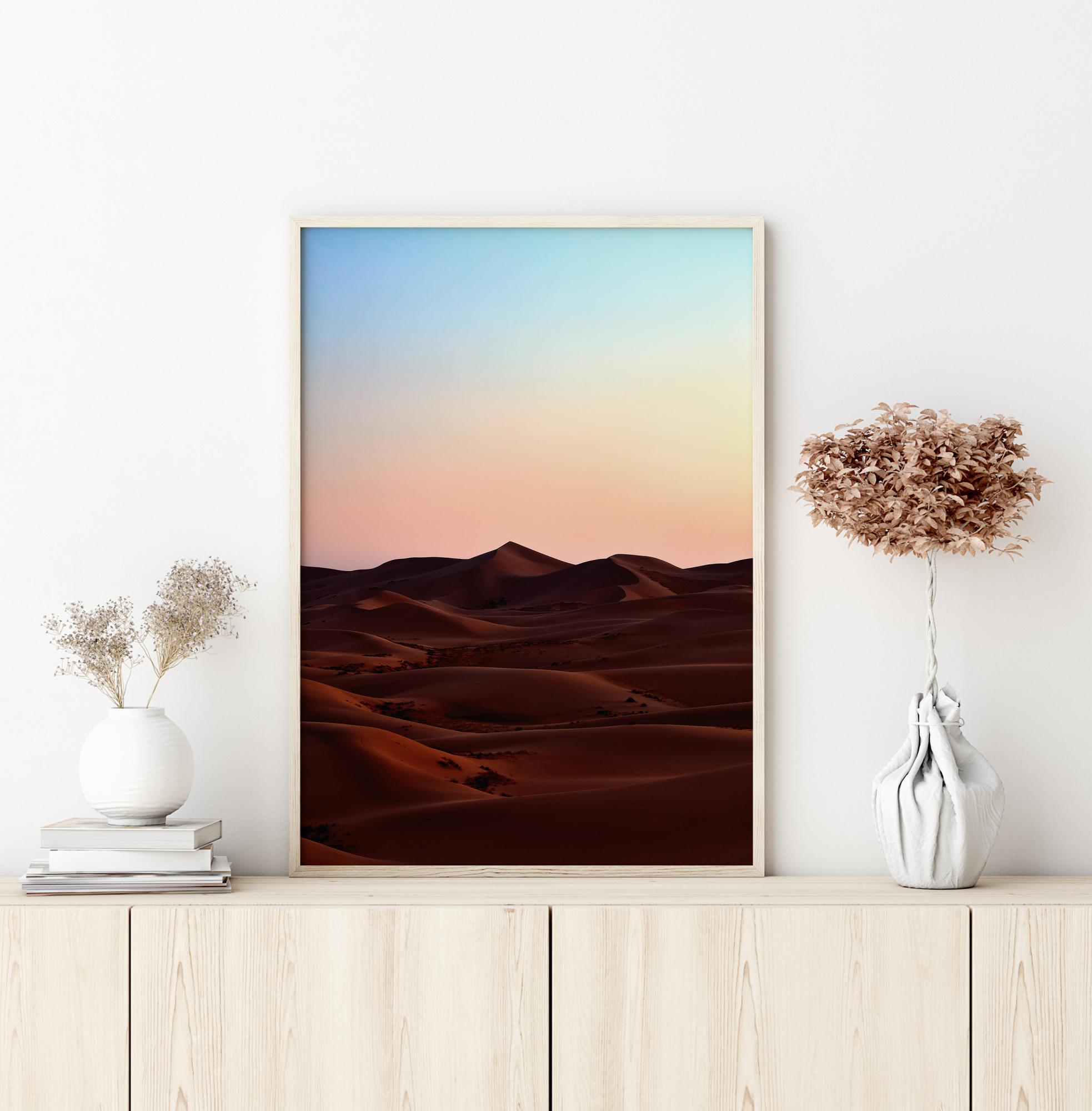 Atmosférický plakát s pouštní krajinou. Hluboká červená poušť zdůrazňuje vlnité písečné duny, které vedou pohled skrze krajinu. Jemně modrá obloha a mlhavé růžové odstíny dodávají pocit brzkého rána. Užijte si rozlehlé prostory přírody, když máte tento obraz visící na stěně.