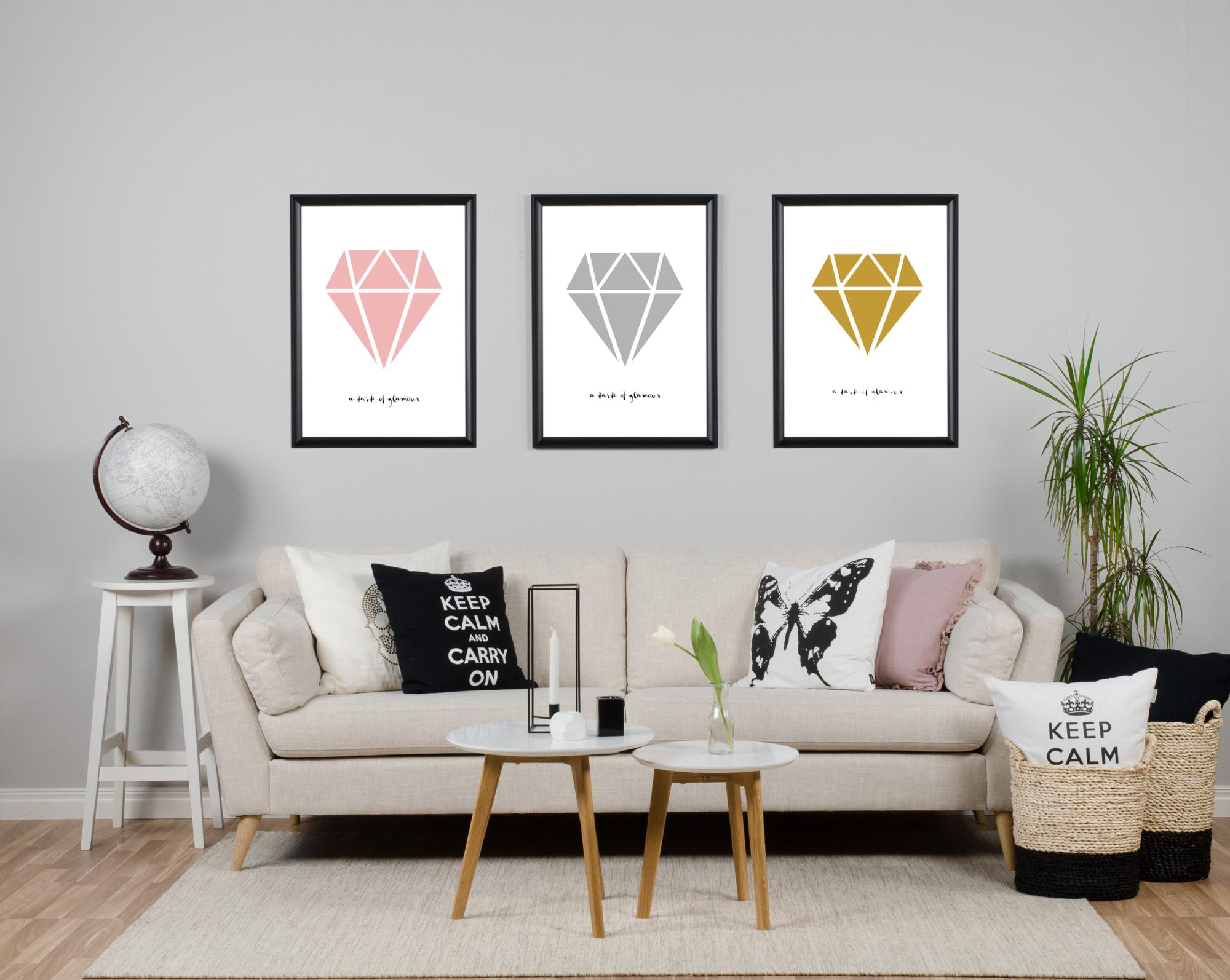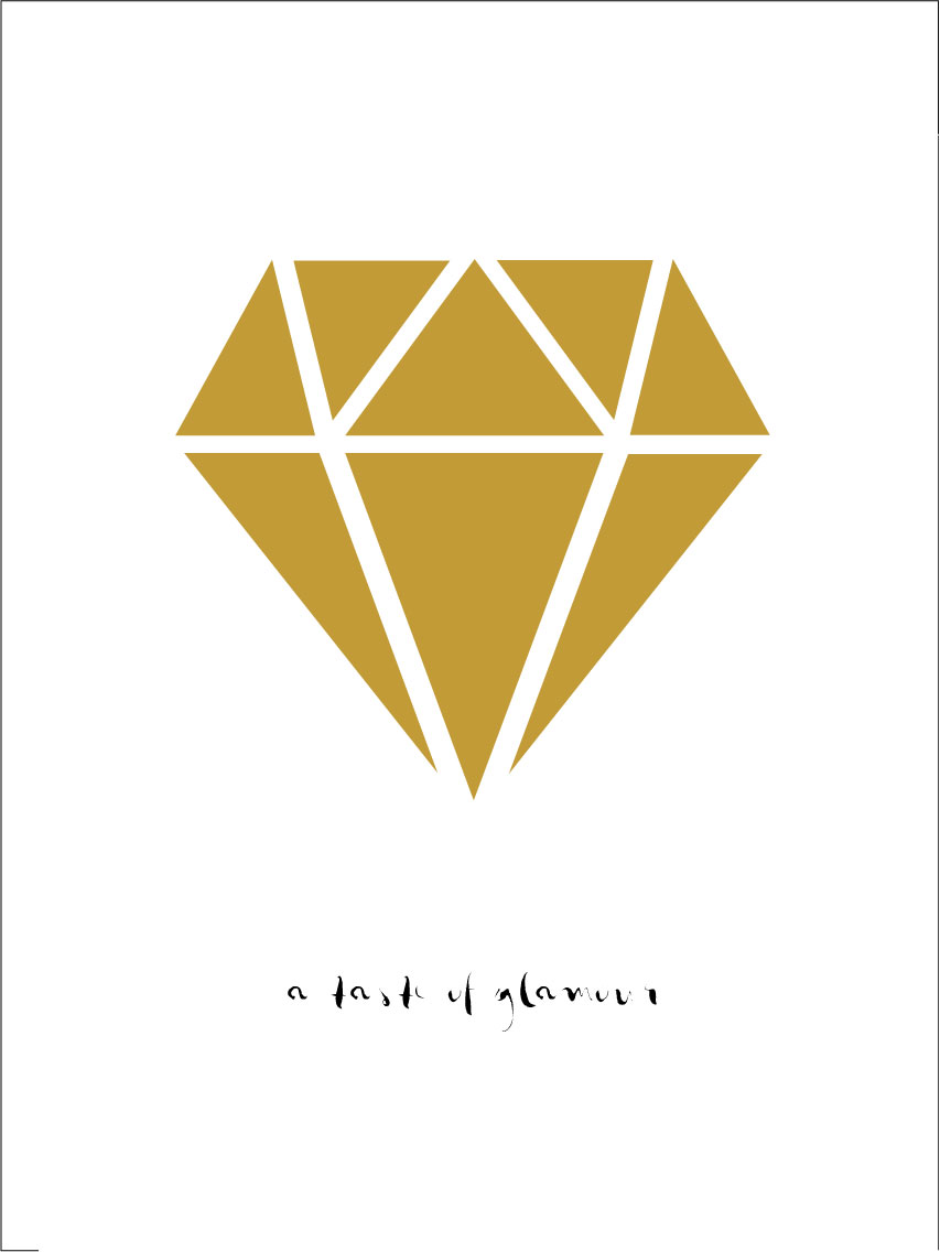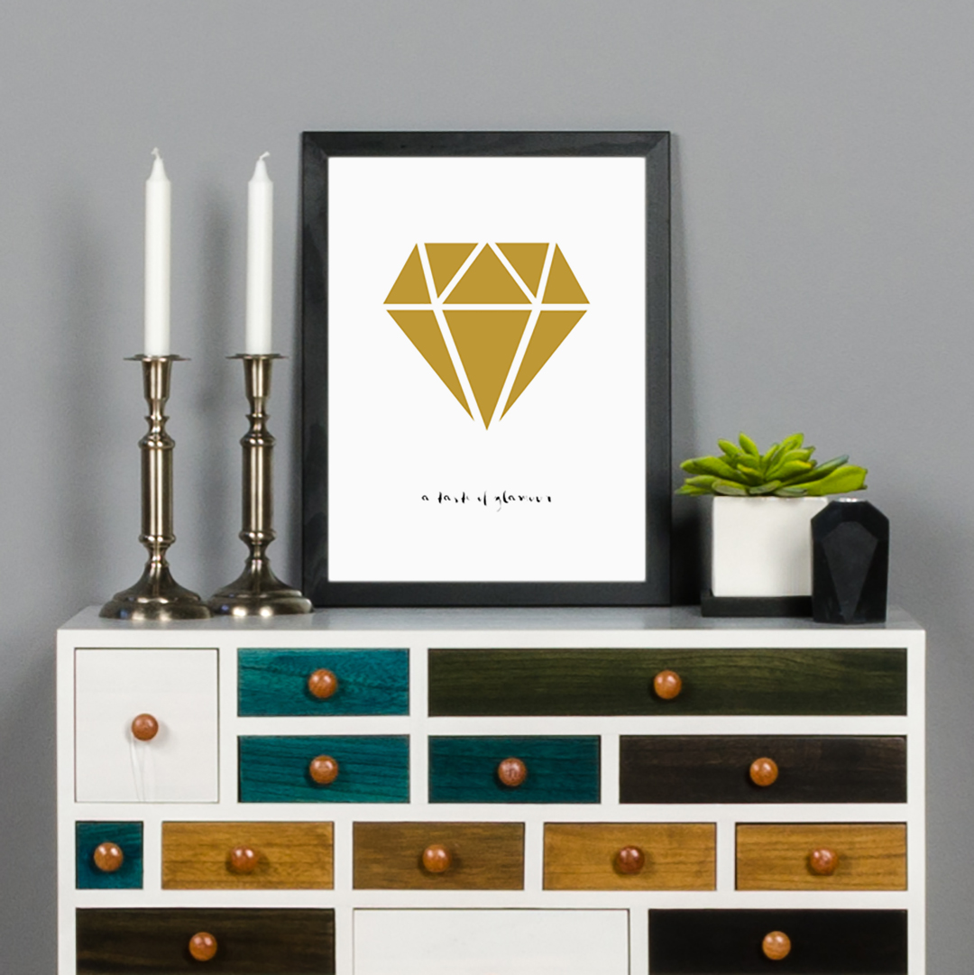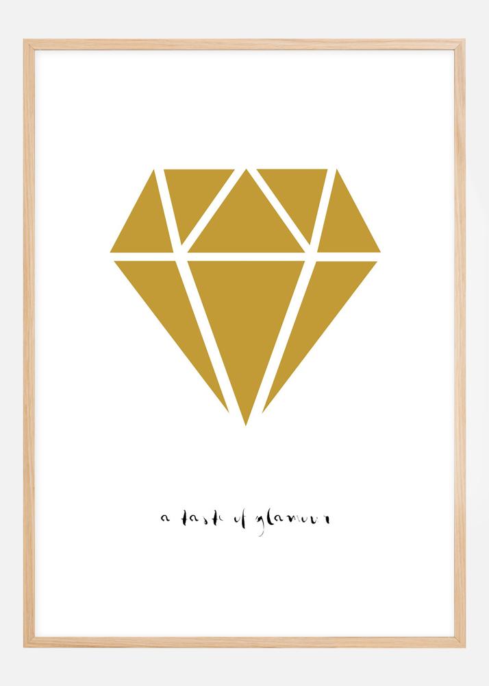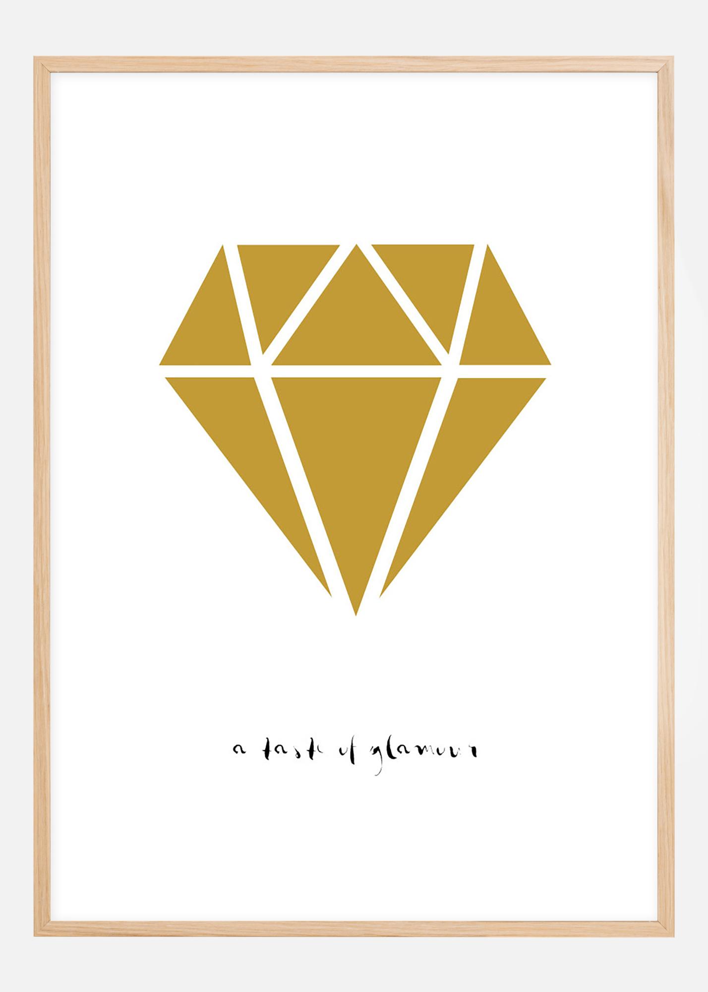 Diamanty jsou nejlepší přítel ženy, ale zde v dostupnější podobě grafického tisku. Dodejte domovu pocit luxusu a elegance s elegantním plakátem, který má motiv diamant v zlaté na bílém pozadí, s textem "a taste of glamour". Každý občas potřebuje trochu půvabu a toto je jednoduchý způsob, jak toho ve svém životě dosáhnout.