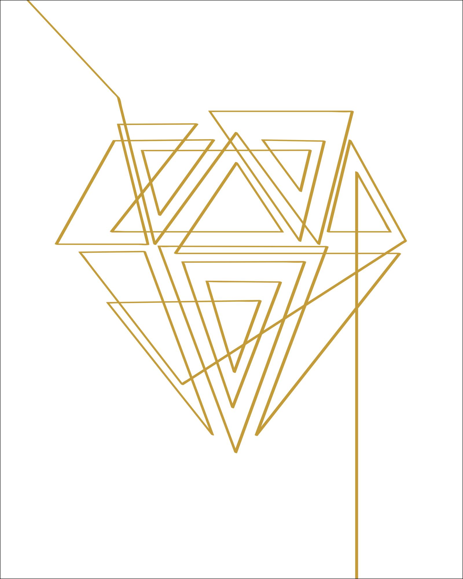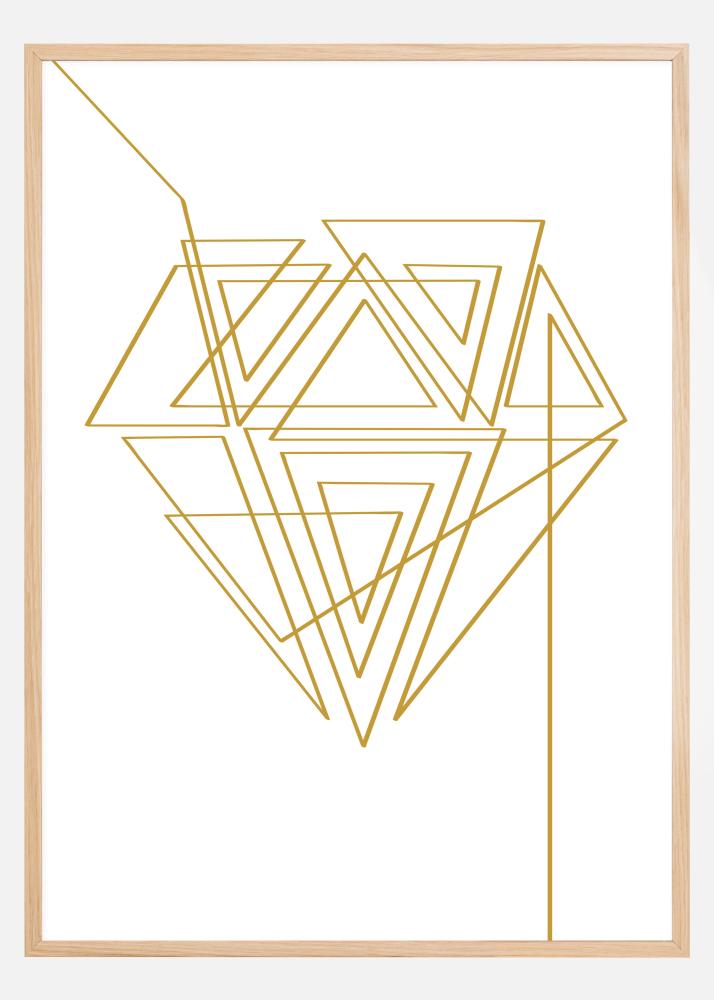 Abstraktní plakát s diamantem ze zlatých geometrických linií. Tento diamant je složitě vytvořen z různých trojúhelníkových tvarů v dlouhé, nepřerušené linii. Sledujte linii a zjistěte, zda dokážete rozmotat celý vzor. Dílo je vytvořeno na bílém pozadí, takže nejlépe vynikne na krémové nebo zlaté stěně.