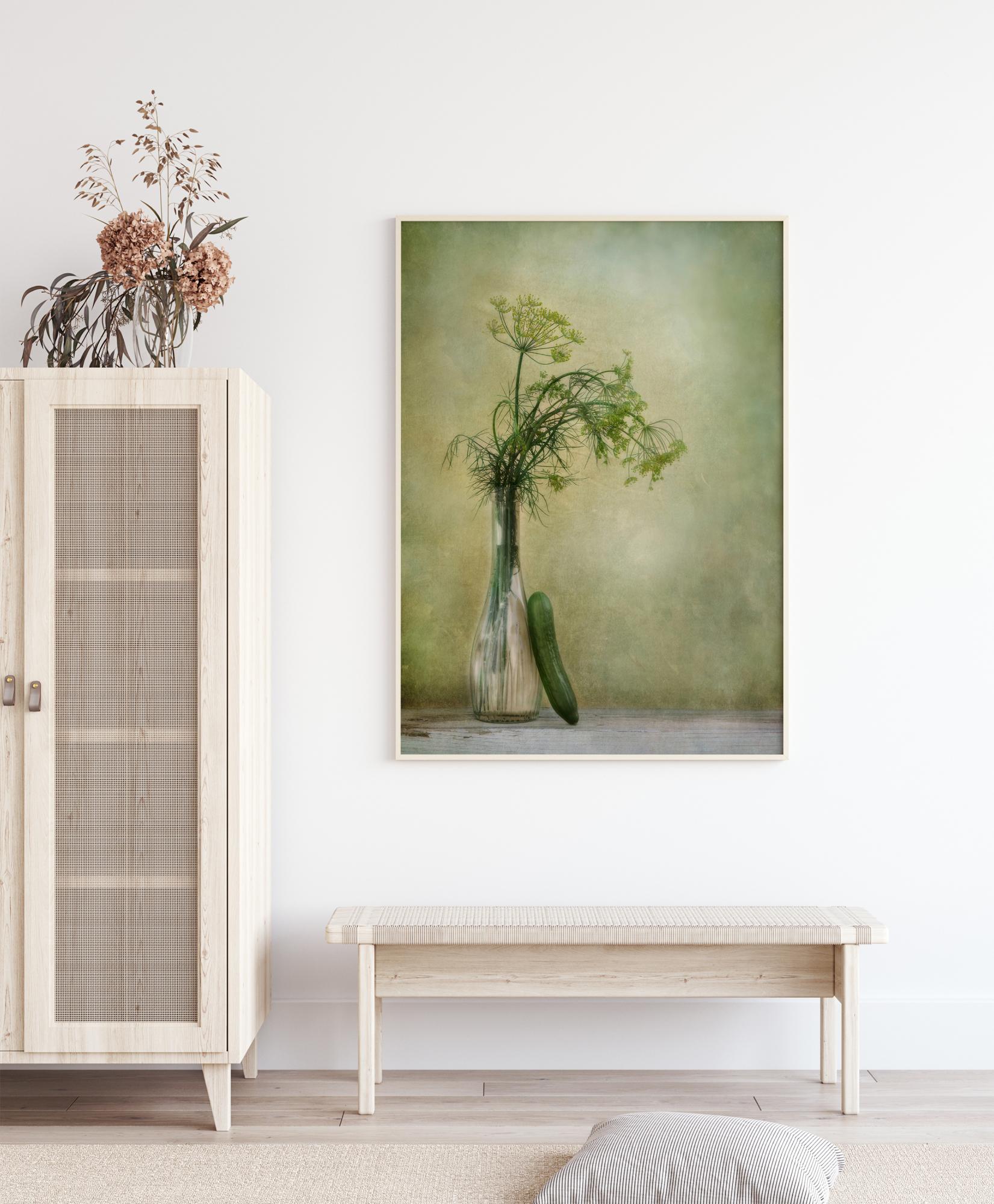 Zeleninový plakát s koprem a okurkou a jemně zelenou a žlutou stěnou. Skleněná váza drží kopr, o který se opírá okurka v této zátiší. Jemné akvarely na pozadí jsou světlejší kolem listů, ale tmavší směrem k okrajům. Zavěste toto dílo v kuchyni pro sladký pocit vegetariánství.