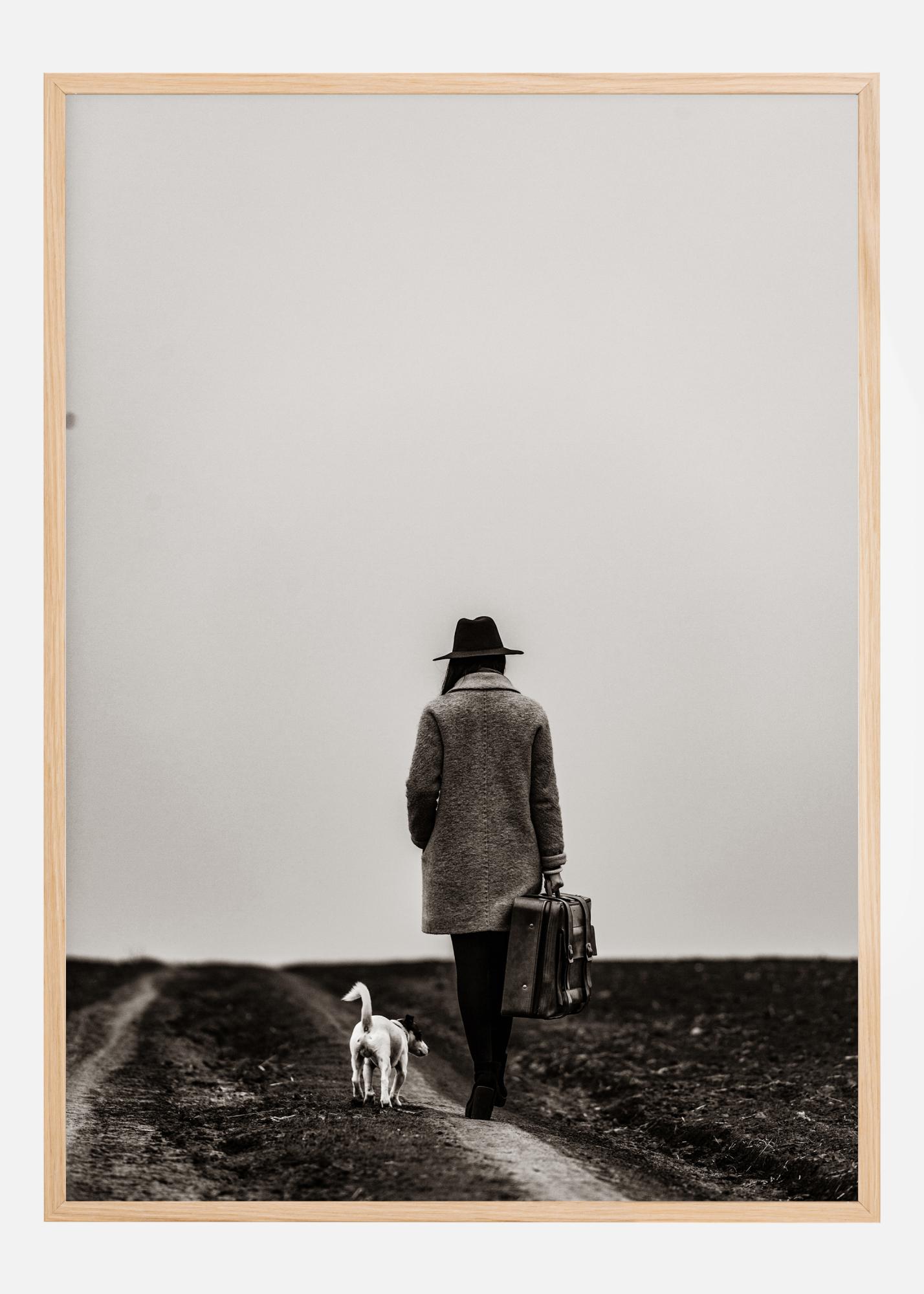 Minimalistický plakát ženy, která jde po cestě se svým psem. Dva jízdní pruhy vedou do dálky, žena nesoucí dlouhý kabát a kufr a její teriér jdou vedle ní. Široká jasná obloha je lákavá. Připojte se k této ženě na jejích cestách, když tento černobílý obraz visí na vaší zdi.