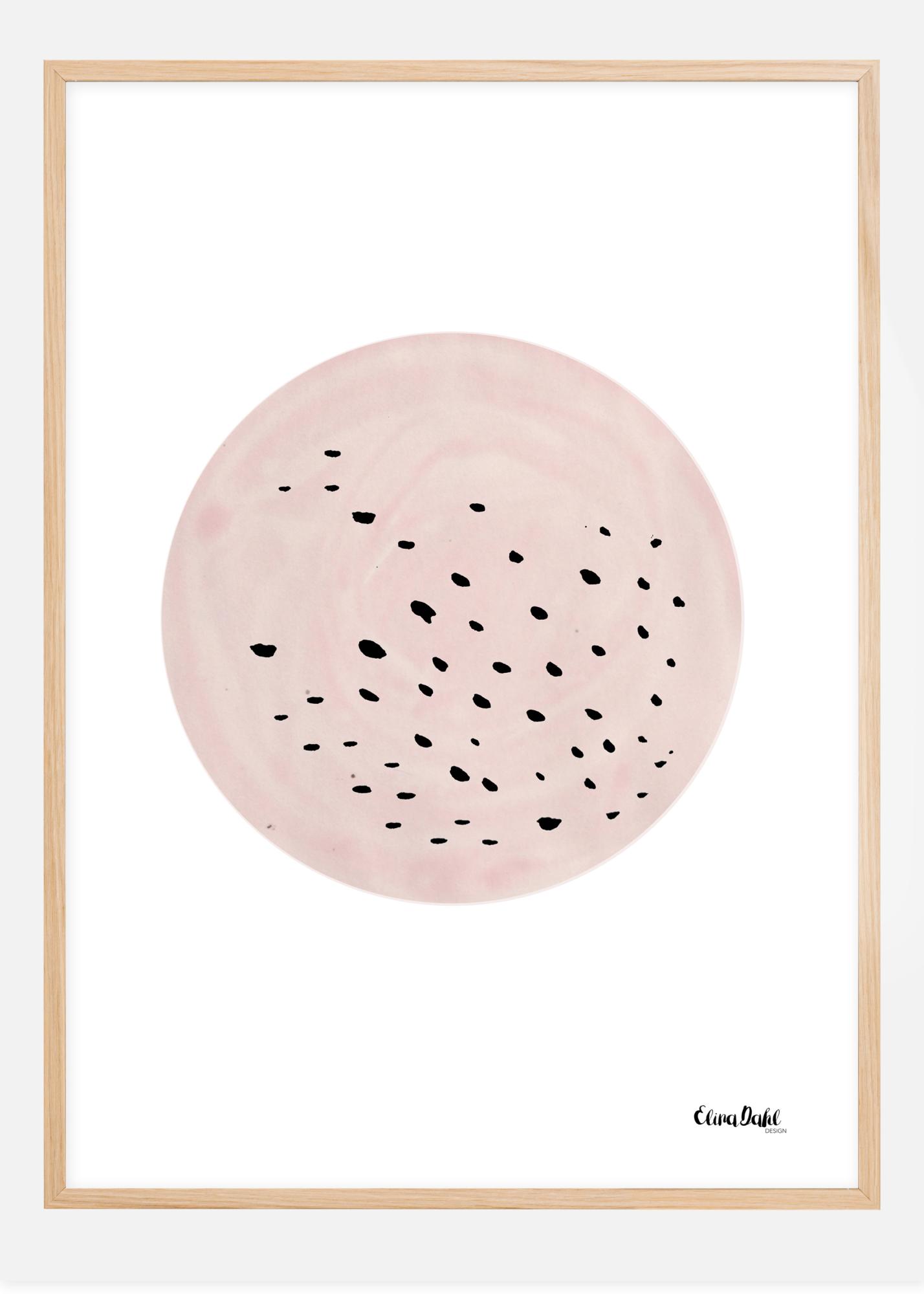 Abstraktní plakát s černými tečkami v béžovo-růžovém kruhu. Tento kruh je vyplněn malými tečkami na povrchu. Koule je umístěna na bílém pozadí. Spojte tento podivný, ale přesvědčivý obraz se silným odvážným pozadím, abyste vytvořili opravdu zajímavou uměleckou instalaci.