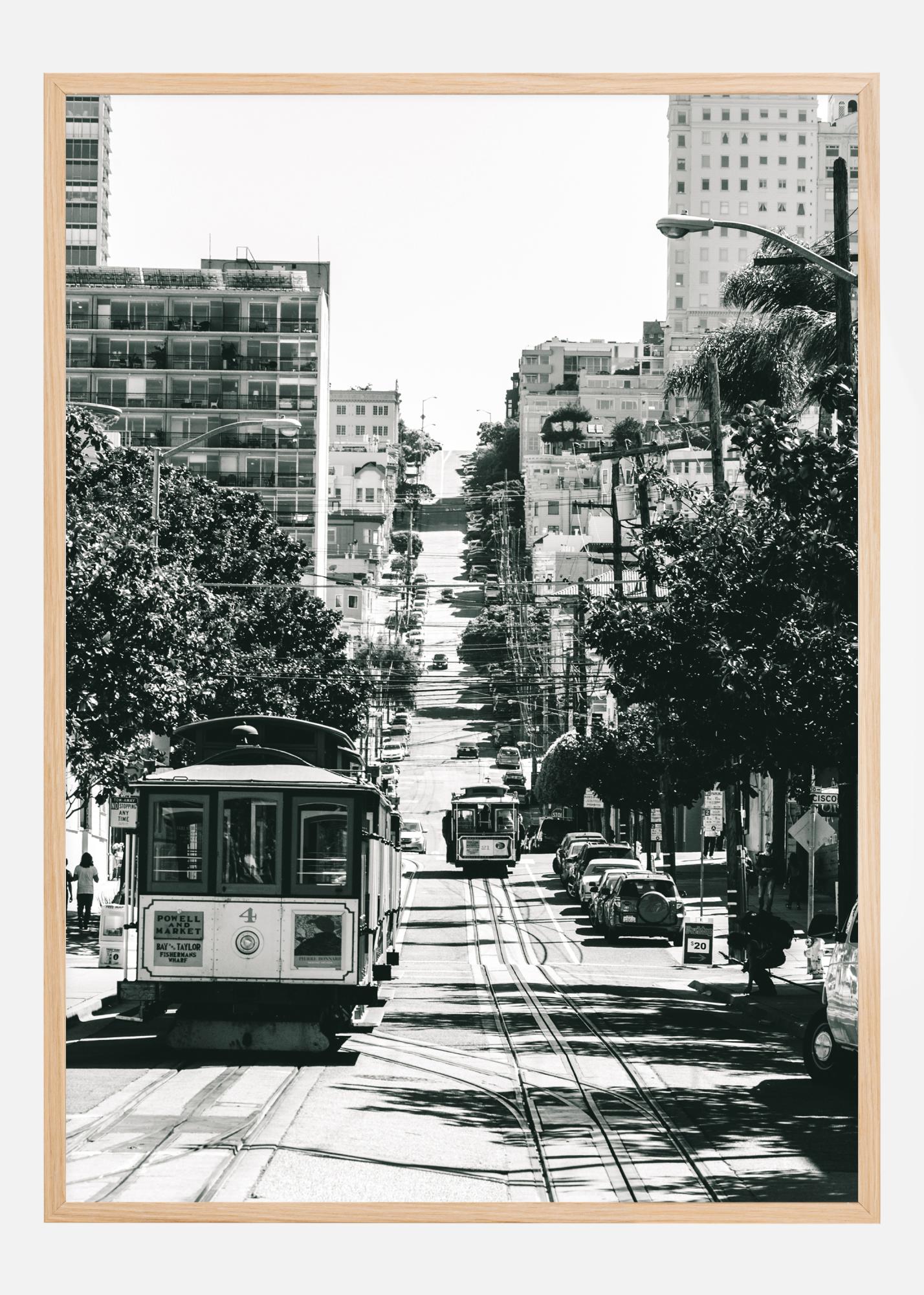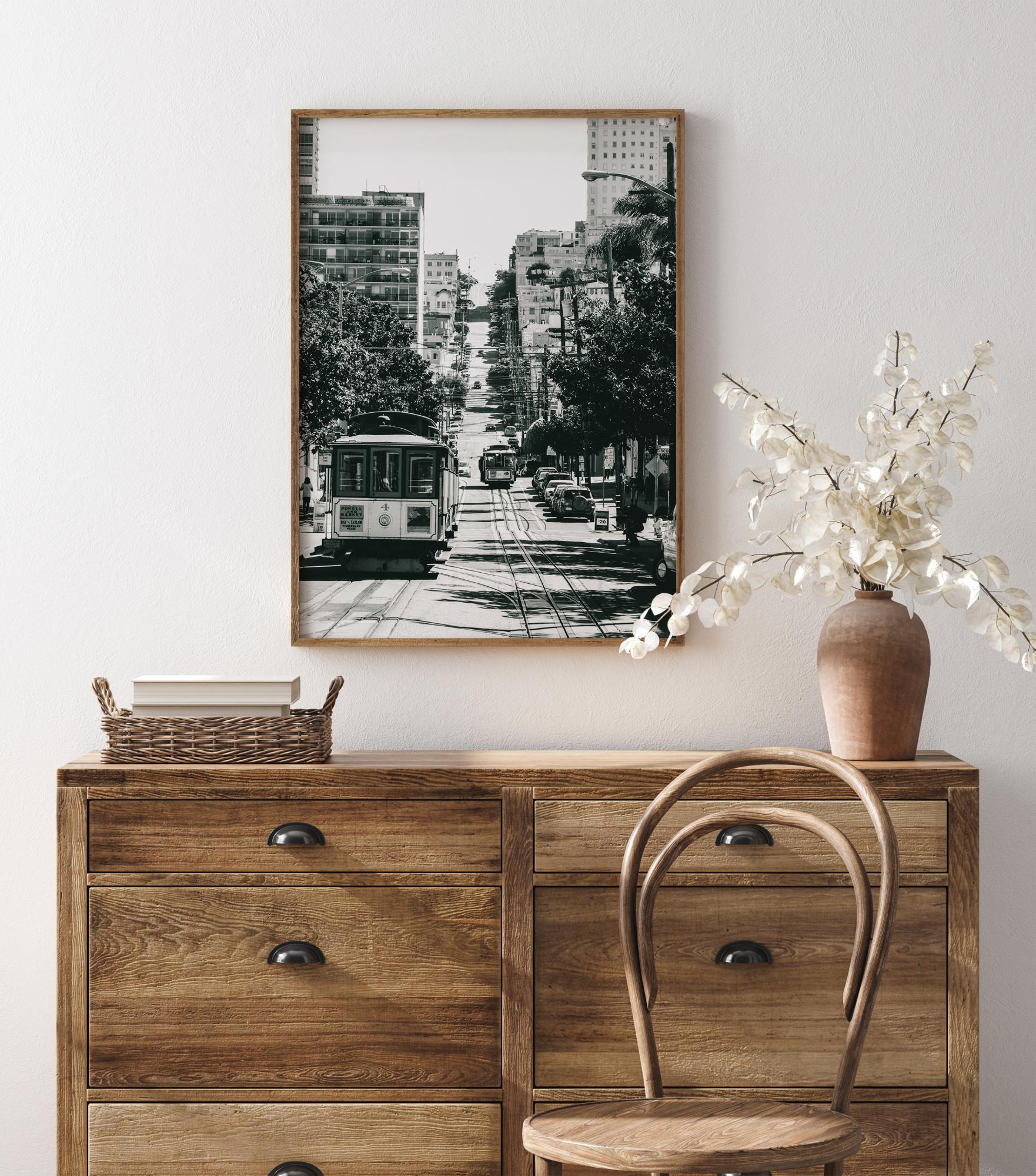 Městský plakát s centrem San Francisca. Tramvaj jede nahoru po kopci mezi domy v popředí s stromy na každé straně. Tento černobílý tisk přidává nádech elegance bez ohledu na to, na kterou zeď se rozhodnete ho pověsit.