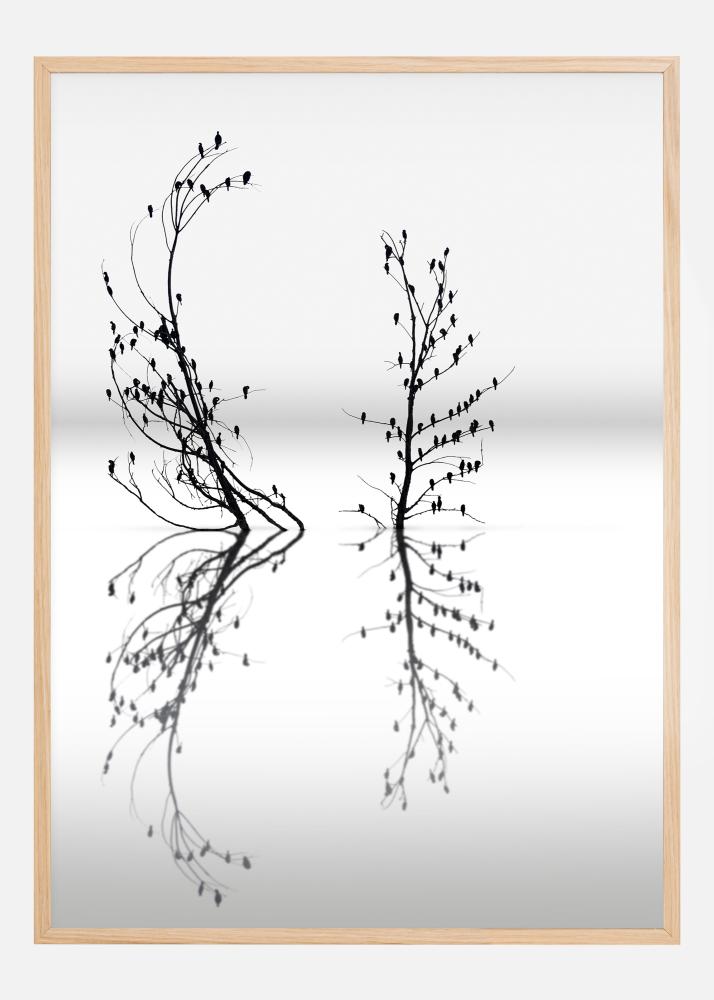 Stylizovaný plakát se dvěma větvemi, které vyčnívají z vody. Tmavé větve, které jsou ohnuté a zkroucené, vrhají své odrazy na klidnou vodu pod nimi. Tlumené modré a bílé odstíny tohoto díla vytvářejí klidnou atmosféru, kterou si můžete užívat, když máte tento obraz na zdi ve svém domově.