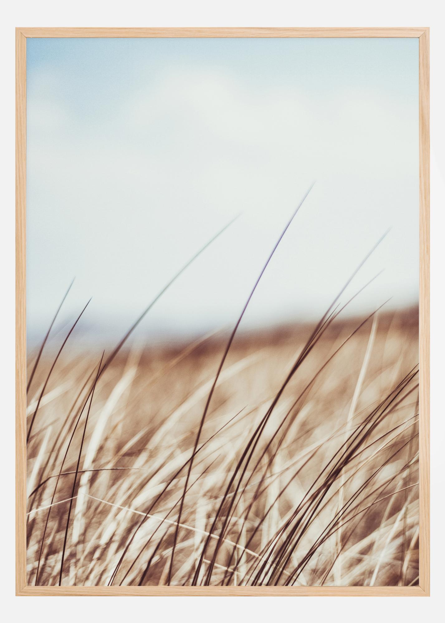 Jednoduchý plakát s trávou, která se vlní ve větru pod zamračenou modrou oblohou. Tlumené hnědé a žluté odstíny trávy a dlouhé stonky vedou pohled vzhůru a do oblak. Snivě se ponořte daleko s pomocí této uklidňující louky s dlouhou trávou zavěšené na vaší zdi.