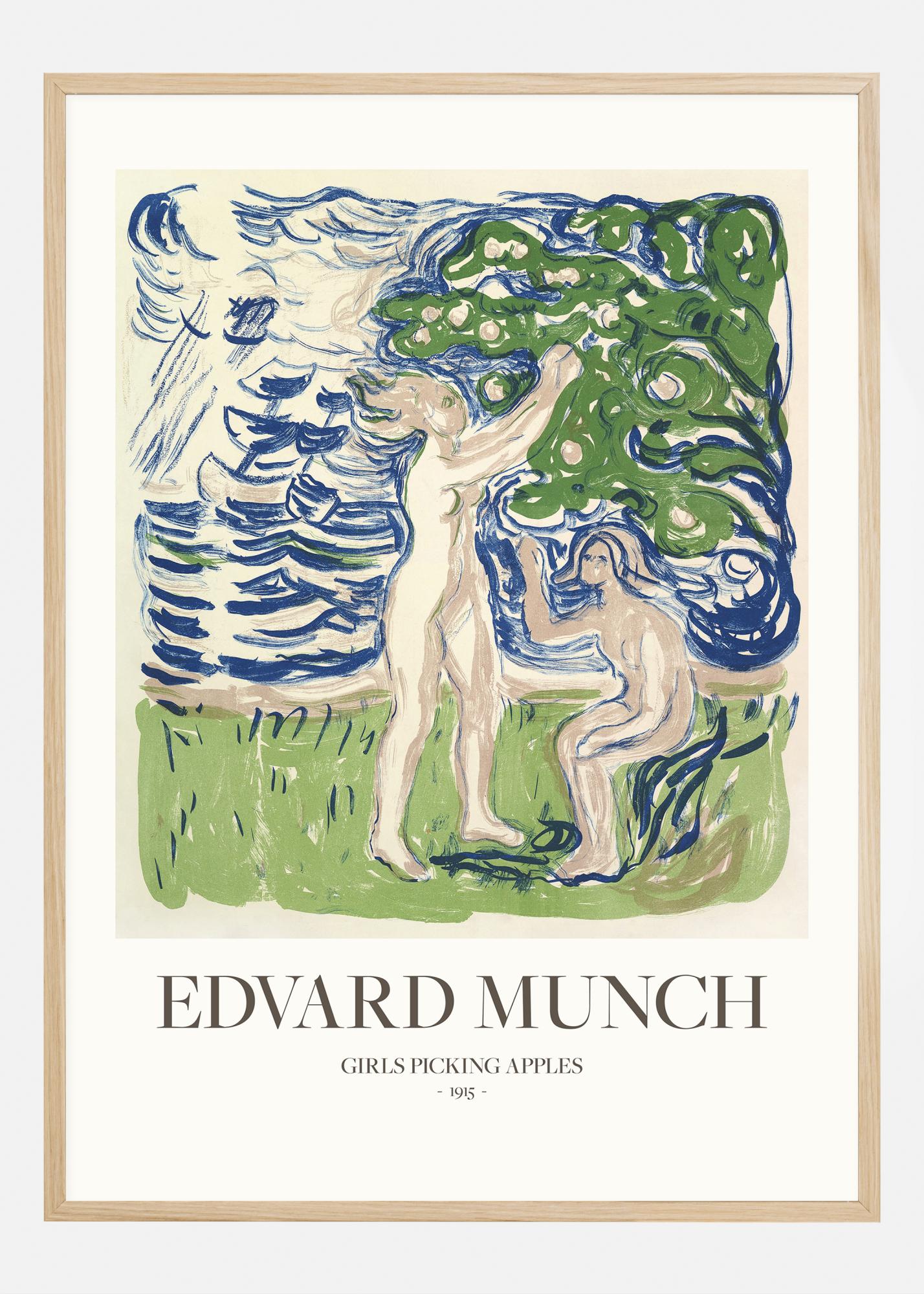Tento plakát ztvárňuje 'Dívky sbírající jablka', dílo z roku 1915 od Edvarda Muncha, které zachycuje idylickou a atmosférickou scénu. Umělecké dílo poskytuje jednoduché, ale výrazné znázornění dvou postav mezi stromy, jejich těla a obličeje zdůrazněné volnými, svobodnými tahy štětcem. Barevné schéma je dominováno čerstvou zelenou a zemitou hnědou, které vytvářejí trávník a kmeny stromů, zatímco modré a bílé nebe poskytuje živé pozadí, které zvýrazňuje jasné jablečnozelené tóny a jemné odstíny pokožky. Tento tisk je poctou k jednoduchým radostem života a dokonalým uměleckým prvkem, který dodá každé místnosti pocit přírody a svobody.
