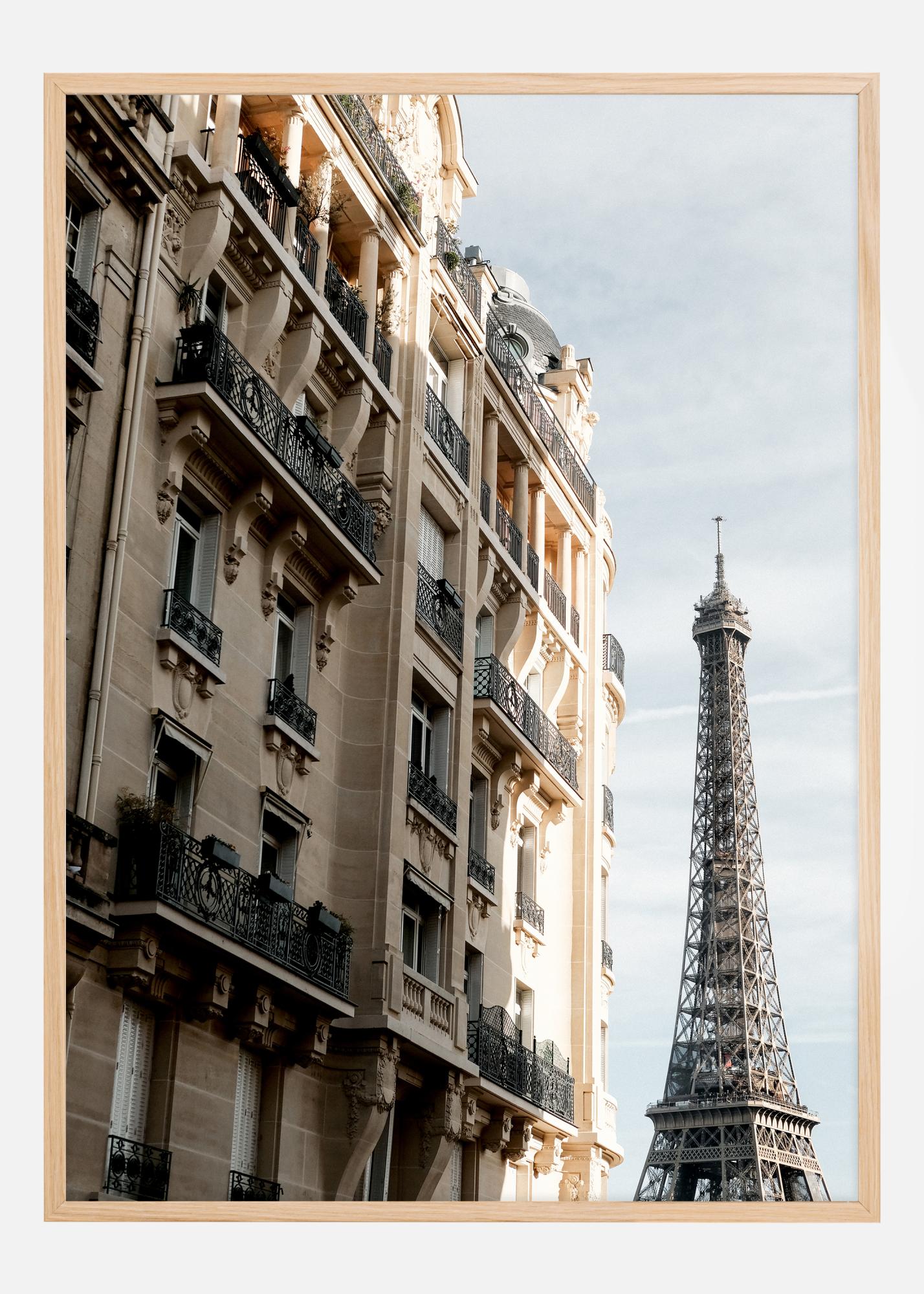 Tento plakát zobrazuje klasický pohled na Paříž, kde se Eiffelova věž hrdě tyčí za typickými obytnými domy města s jejich kovanými balkony a sochařskými fasádními detaily. Je to scéna, která dýchá pařížskou atmosférou a elegancí, ideální pro dodání francouzského šmrncu do jakéhokoli domova. Obraz zachycuje dokonalou rovnováhu mezi architektonickými klenoty města a otevřenou oblohou, což přináší pocit prostornosti a svobody, který je synonymem pařížské duše.