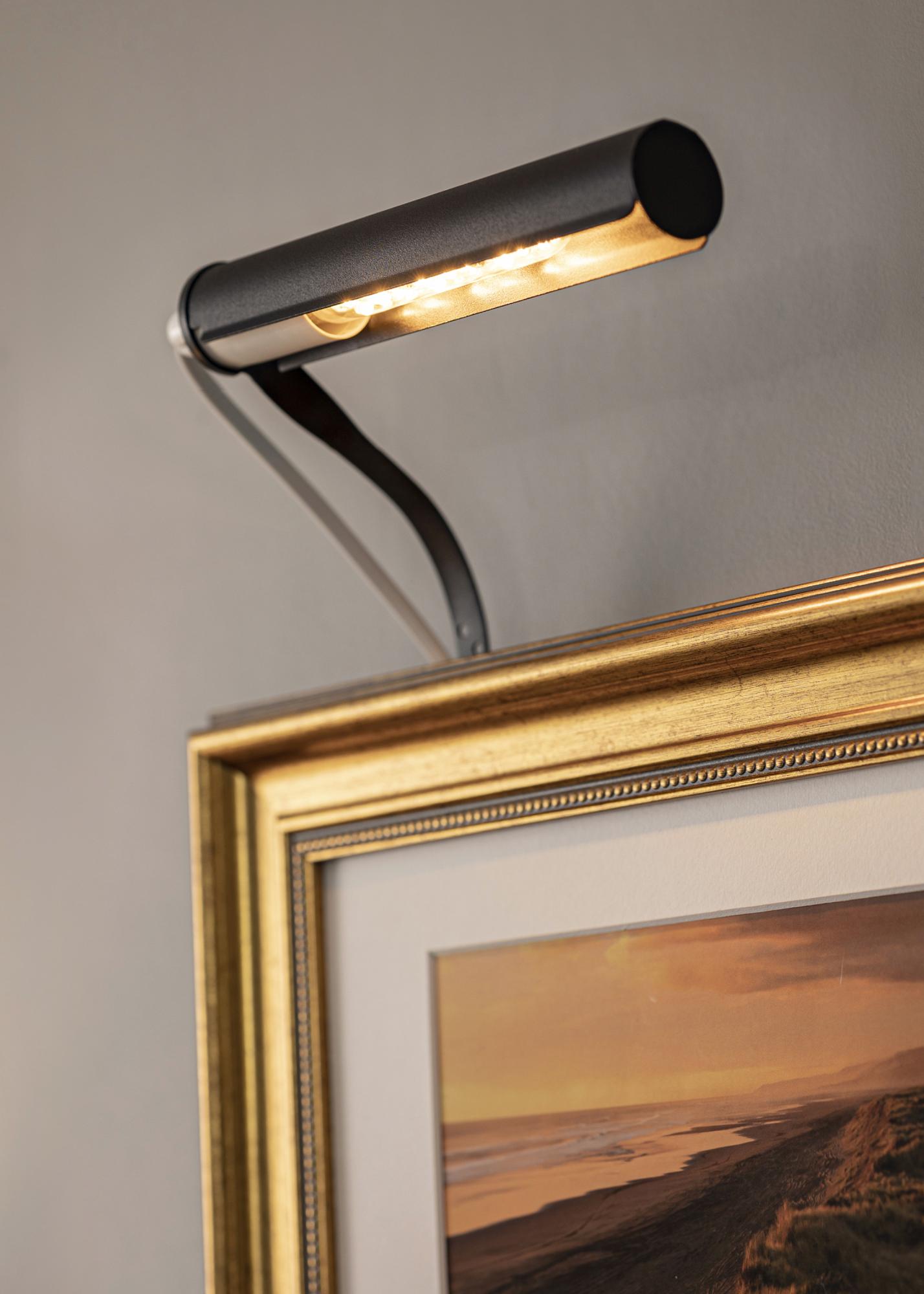 Osvětlení obrazu obvykle připevňujete na zadní stranu rámu, nevýhodou toho je, že je třeba mít dřevěný rám (některé kompozitní rámy také fungují), který má široký profil, aby bylo možné šroubovat do rámu. S naším nástěnným držákem si s tím nemusíte dělat starosti a jednoduše namontujete osvětlení obrazu přímo na zeď za obrazem.