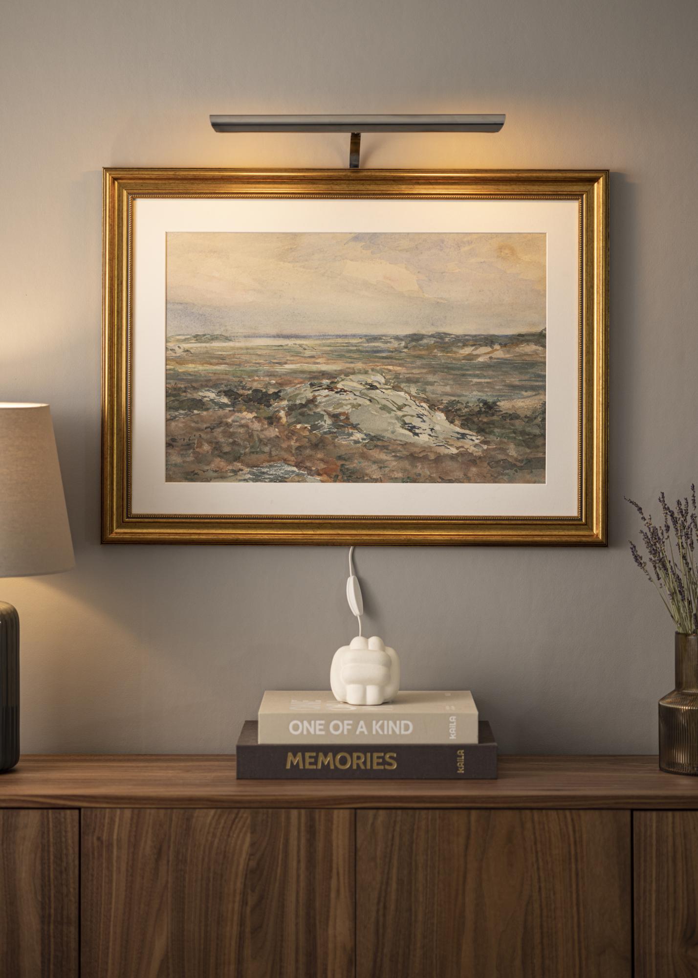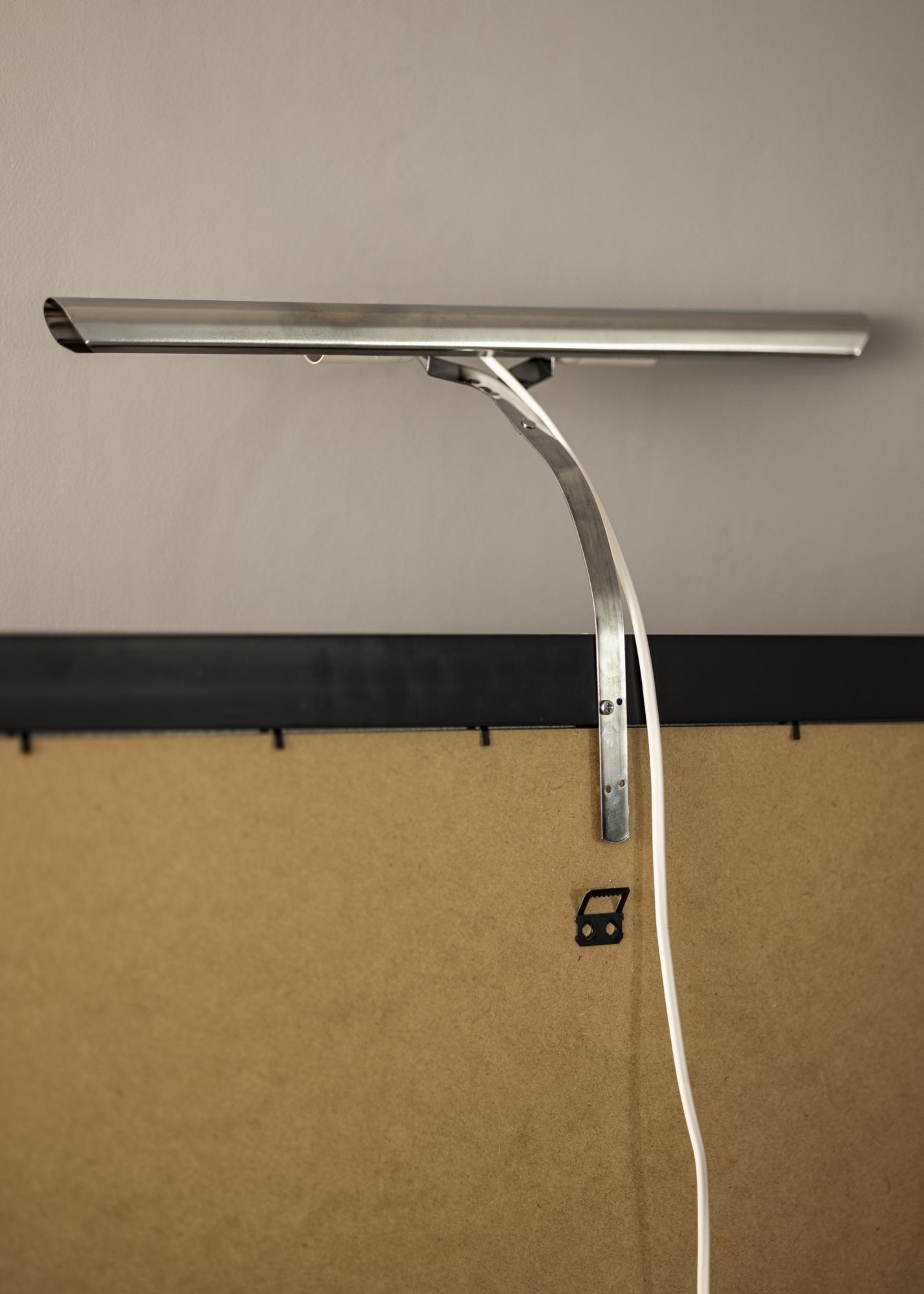 Obvykle připevňujete osvětlení obrazů na zadní stranu rámu, nevýhodou je, že je potřeba dřevěný rám (některé kompozitní rámy také fungují), který má široký profil, aby bylo možné do rámu šroubovat. S naším nástěnným držákem nemusíte na to myslet a jednoduše namontujete své osvětlení obrazů přímo na stěnu za obrazem.