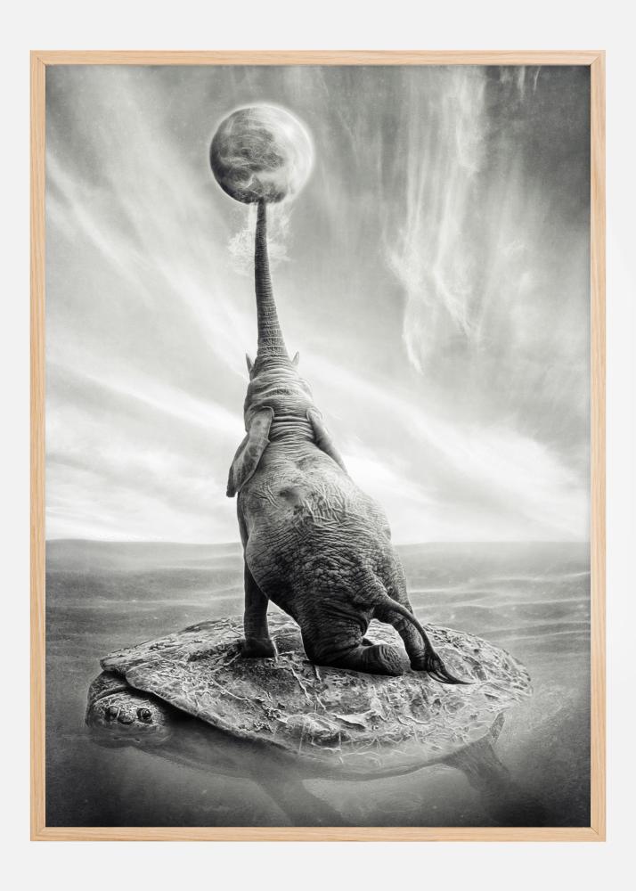 Tento fascinující černobílý plakát zachycuje surreálný obraz slona, který stojí na želvě a balancuje světovou kouli na svém chobotu. Obraz vyzařuje silnou symboliku a pohrává si s prvky mytologie a fantazie. Texturovaná kůže slona a želvy, detailní a výrazná, dodává dílu téměř hmatovou dimenzi, zatímco rozmazané pozadí mraků a krajiny přispívá ke snové a éterické atmosféře.
