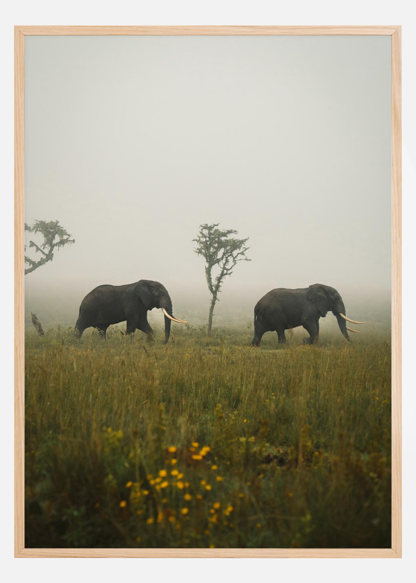 Přírodní fotografie páru slonů, kteří se toulají ve vysoké trávě mezi holými stromy. Hustá mlha v pozadí vytváří ostré kontrasty, které výrazně zdůrazňují tato velká zvířata. Plakát pro ty, kteří milují savanu a její největší obyvatele!