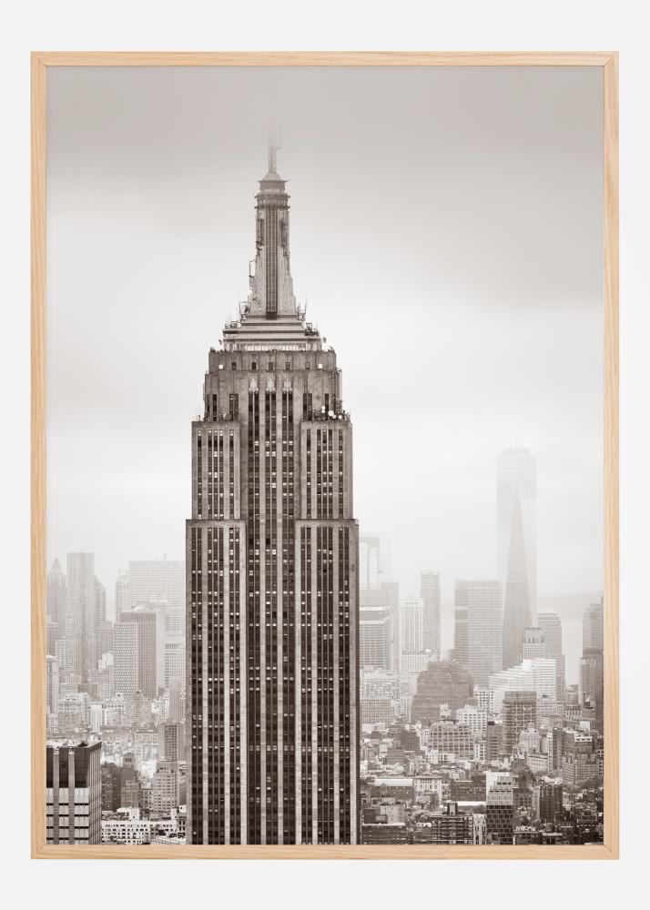 Městský plakát s Empire State Building v New Yorku. Empire State Building je zde v centru pozornosti, jak se tyčí s New Yorkem v pozadí. Zbytek města je částečně zahalen v mlze, což umožňuje, aby detaily tohoto mrakodrapu vynikly jasně. Představte si, že toto je váš výhled, když si ho pověsíte doma.