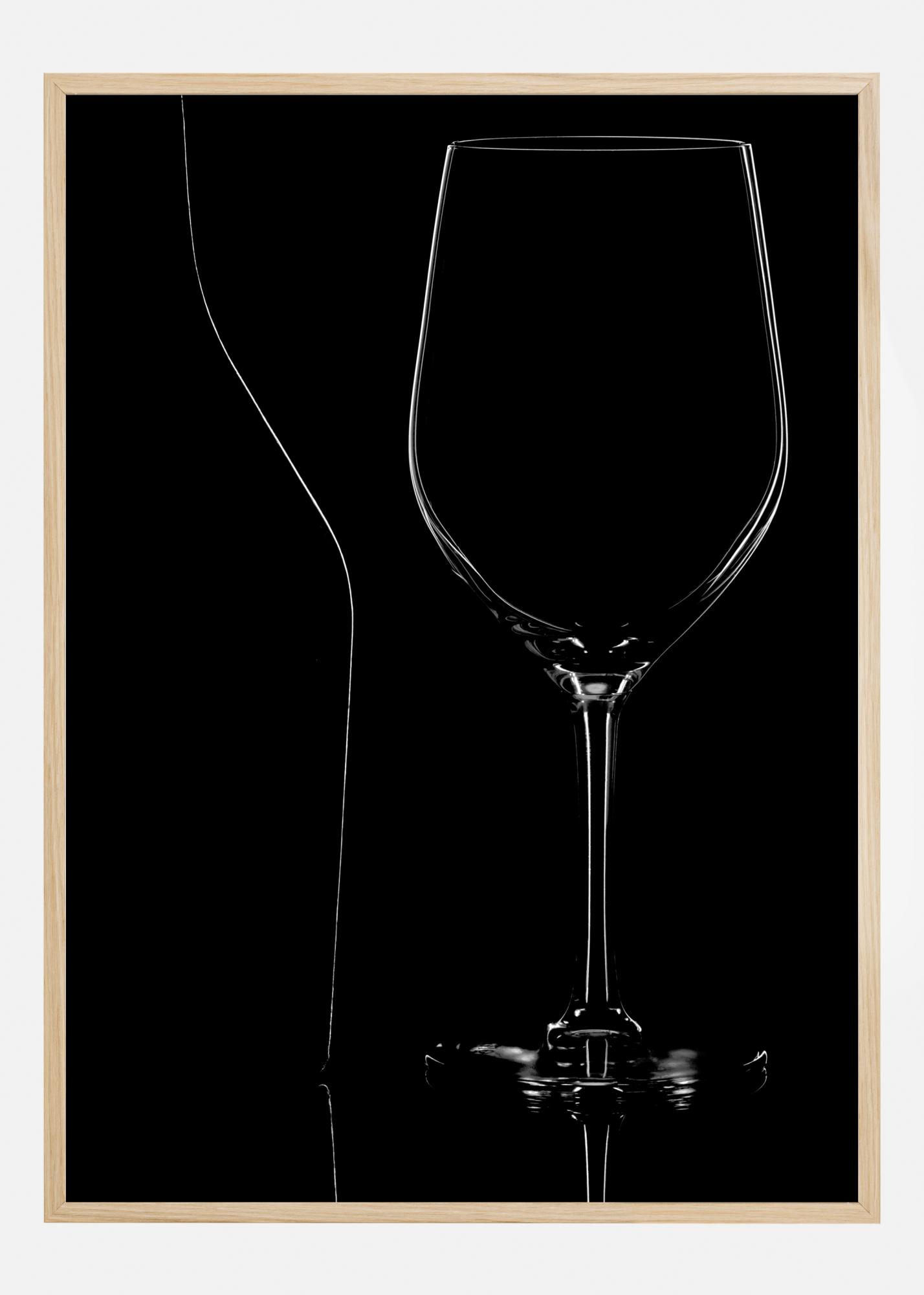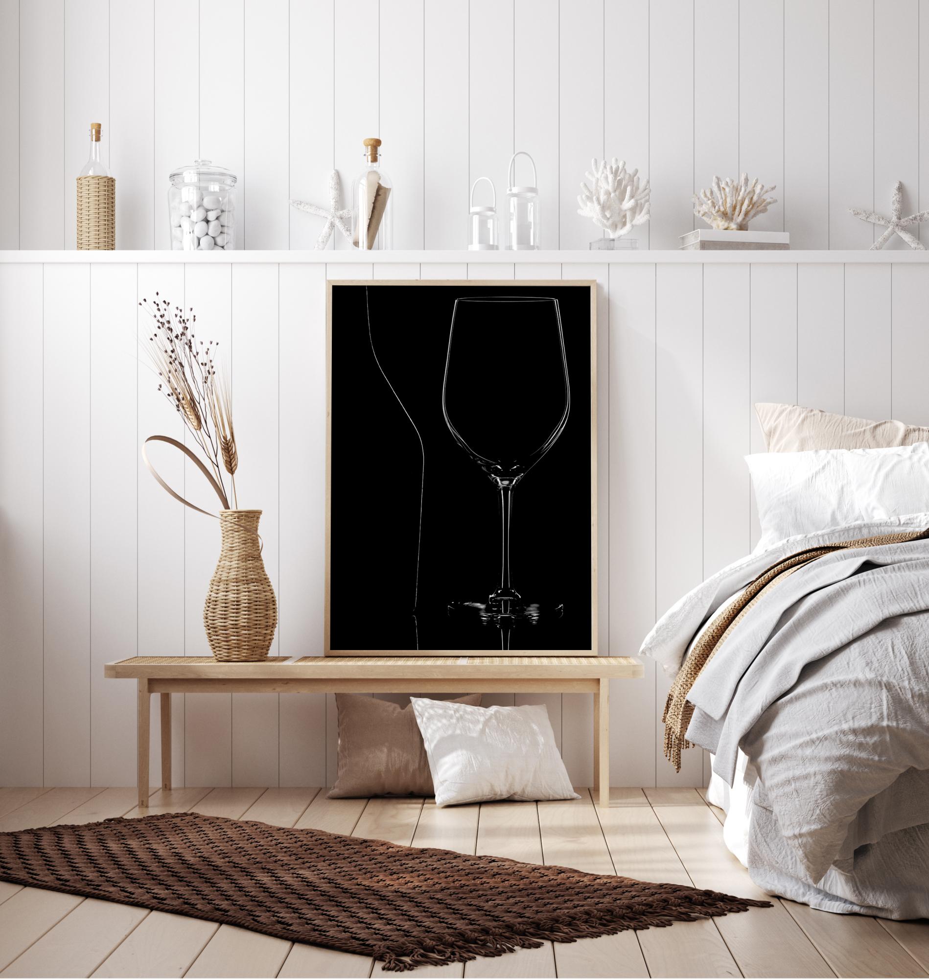 Elegantní plakát se sklenicí vína na černém pozadí. Tento abstraktní obraz vyzařuje klasiku, protože vidíte pouze sklenici pomocí odraženého světla kolem okrajů. Spárujte jej s bílou stěnou, abyste zachovali dramatickou eleganci.