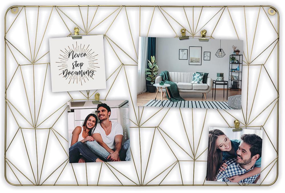Kolažní rám navržený jako nástěnka, na kterou připevníte své fotografie pomocí klipsů. Rám je vyroben z kovu a má zlatavý odstín. Jelikož fotografie připevňujete sami, můžete si vybrat, že smícháte fotografie různých velikostí a také projevit svou kreativitu a připevnit například menší plakáty nebo pěkné poznámky! Rám měří 62x41 cm vnějších rozměrů. Tento rám se hodí zejména nad psací stůl, do kuchyně nebo kdekoli jinde, kde může uplatnit svůj dekorativní a funkční účel. Nástěnný úchyt je k dispozici.