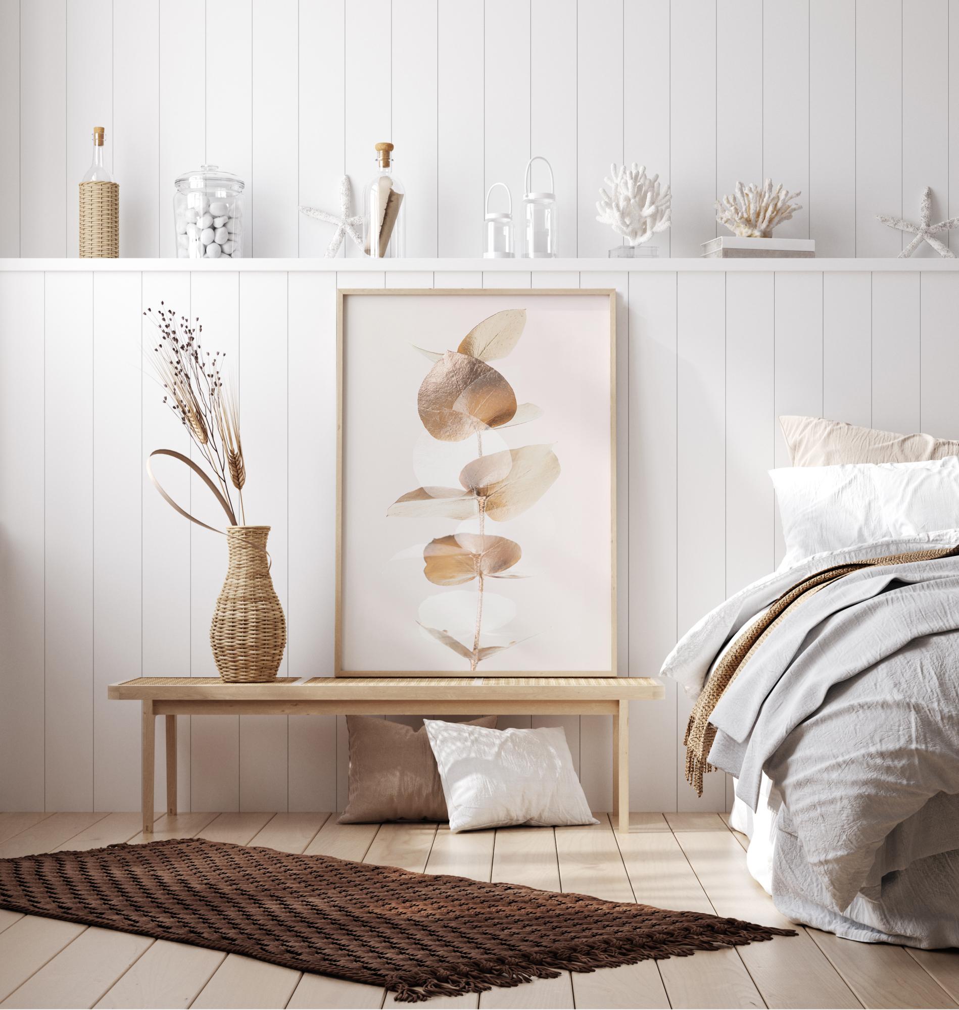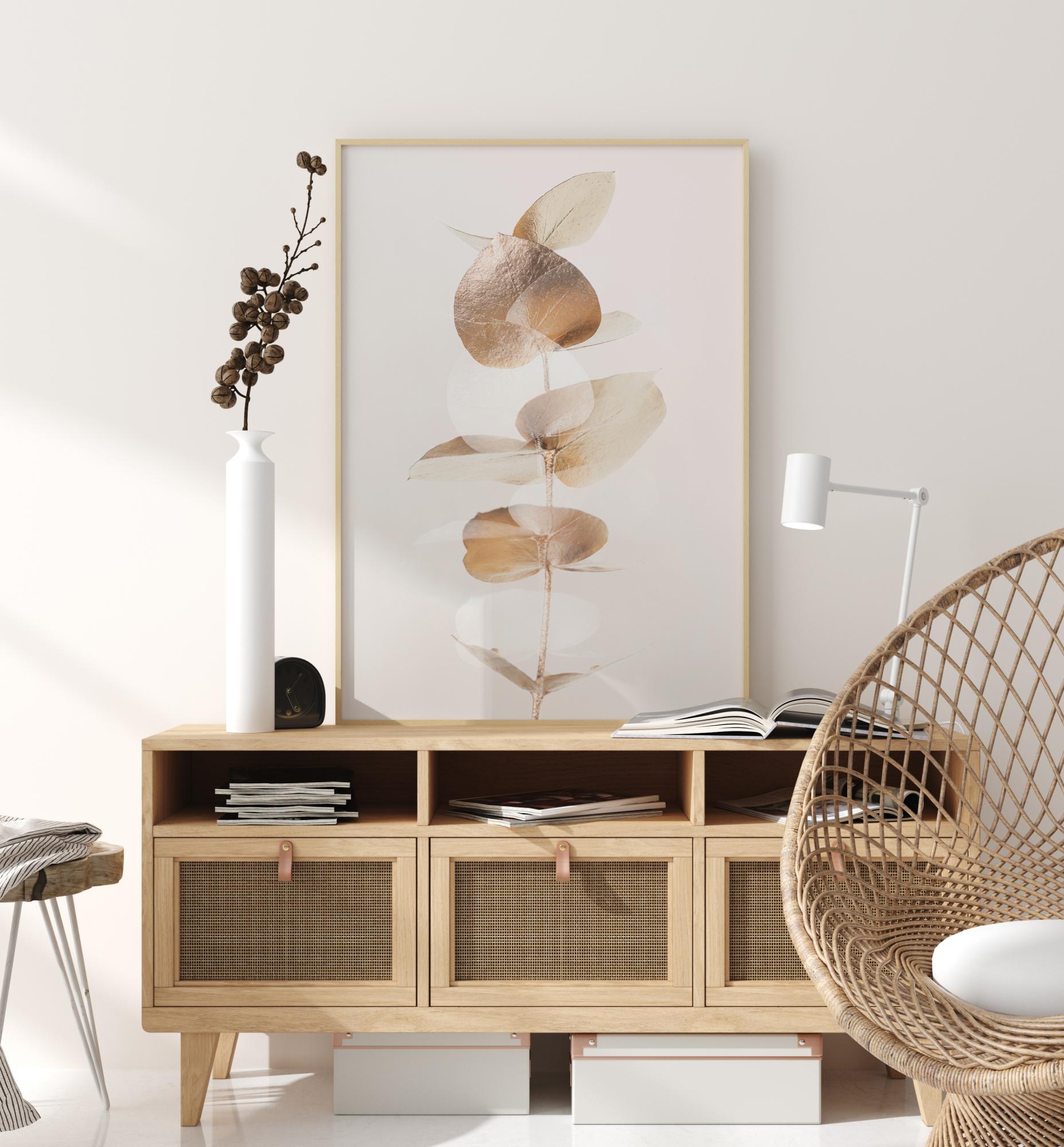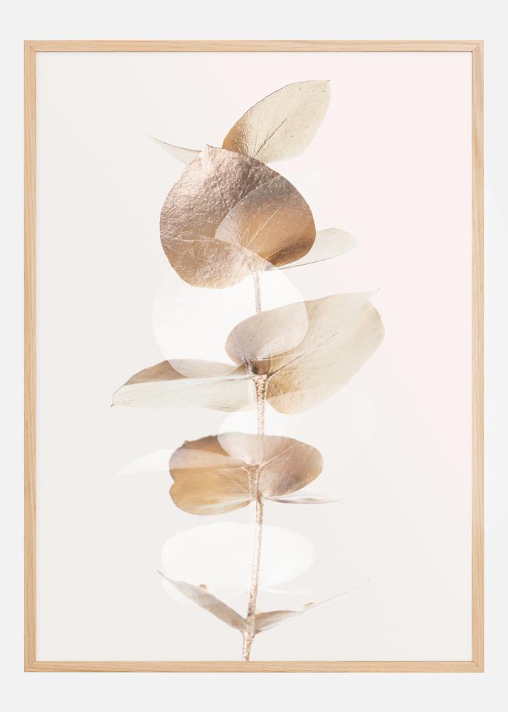 Detailní plakát s několika zlatými listy eukalyptu. Jednoduchá elegance tohoto obrazu je umocněna jednoduchým bílým pozadím. Zlaté listy jemně třpytí, když zaplňují plakát svým měkkým zářením, které vytváří pocit klidu v domě.