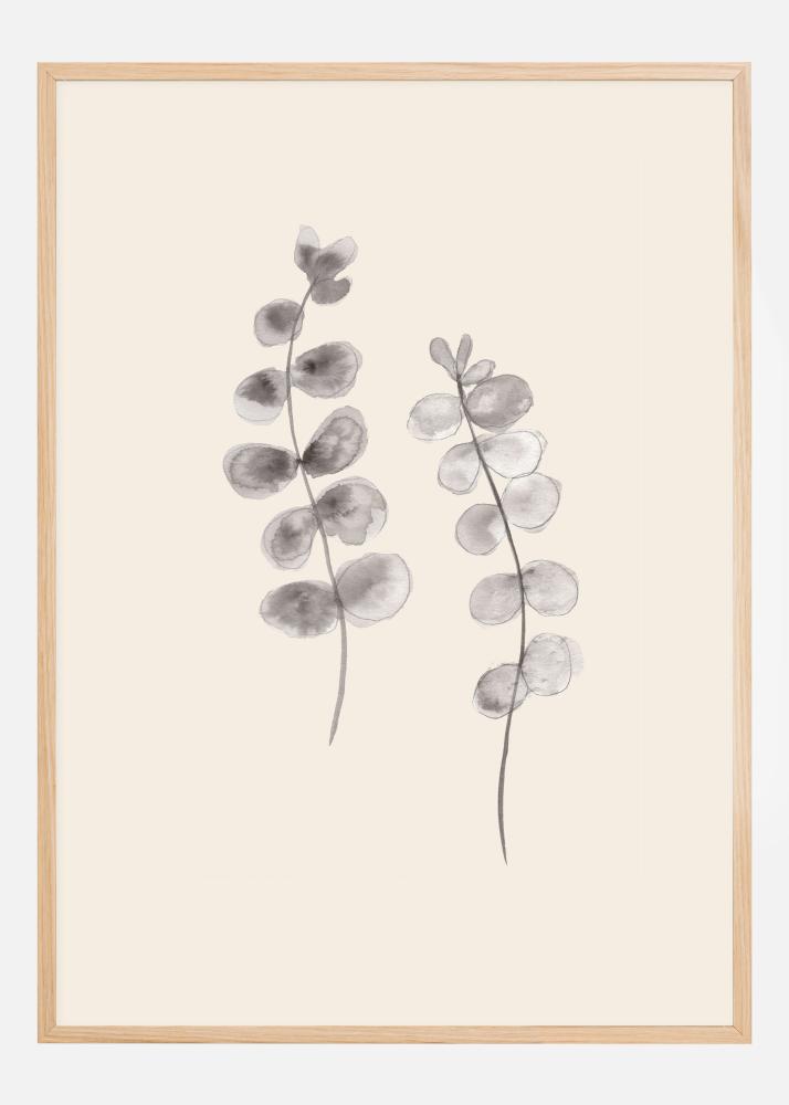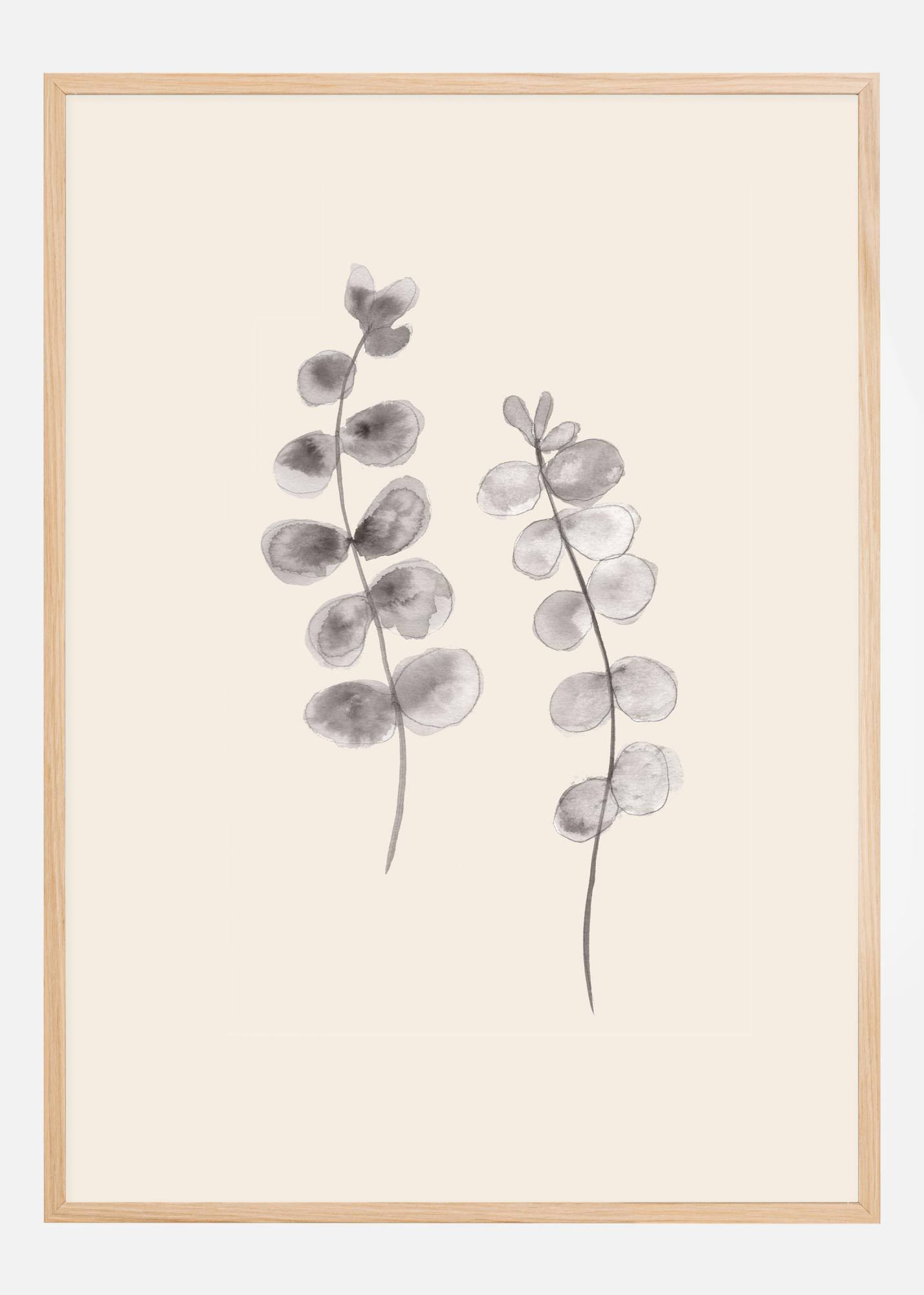 Botanický plakát se dvěma šedými větvičkami s listy eukalyptu. Uprostřed bílého pozadí jsou dvě šedě malované větve s listy eukalyptu. Ohýbají se společně a vytvářejí jemnou křivku, která vede pohled nahoru plakátem. Zavěste tento bujný tanec ve svém domově pro uklidňující pocit.
