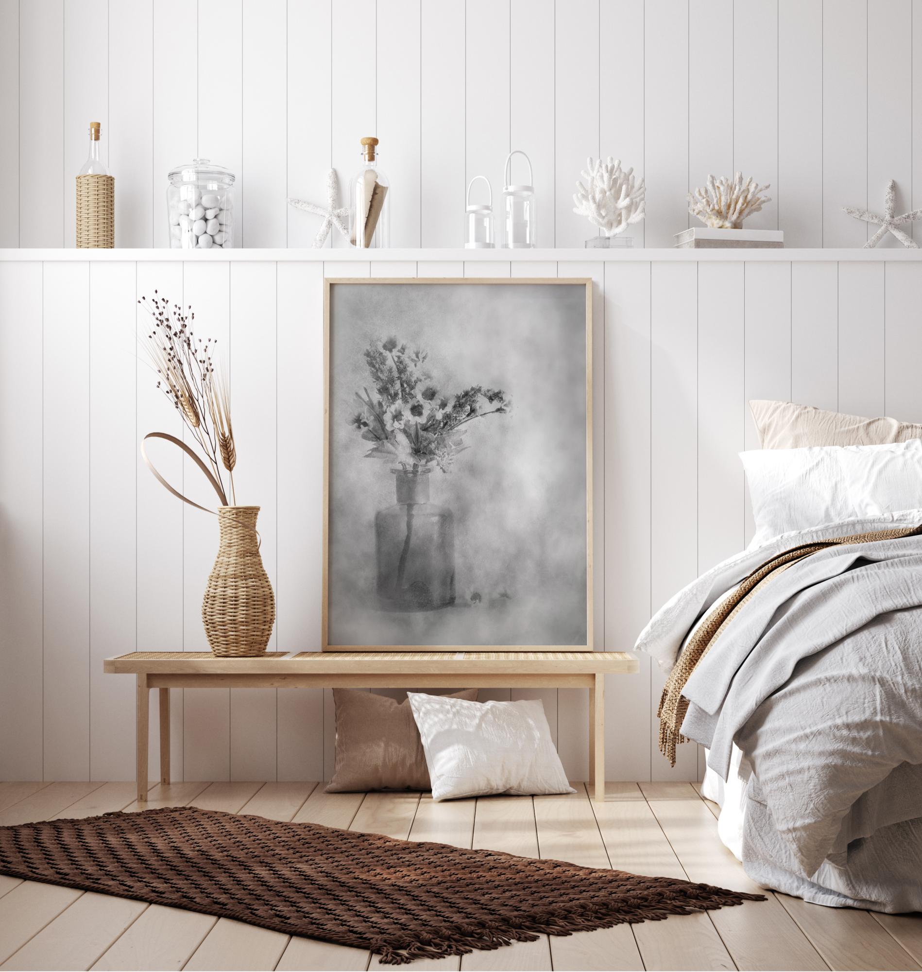 Romantický plakát s jemným zátiším s vázou a květinami. Tento obraz v odstínech šedé má jemný malovaný pocit a minimální kontrasty mezi jednotlivými částmi obrazu. Představte si, že se sami připravujete malovat tuto klidnou scénu, když ji zavěsíte na pastelově zbarvenou zeď doma.