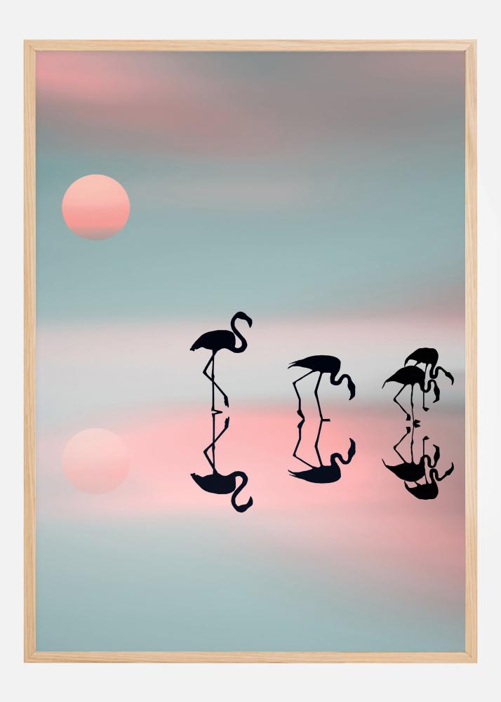 Živý plakát se čtyřmi plameňáky, kteří se krmí u světlého pastelového jezera. Modré, růžové a broskvové světlo vytváří jemný obraz se siluetou plameňákové rodiny, která se opatrně pohybuje přes jezero. Téměř můžete cítit klid v tomto jemném, nenápadném obrazu.