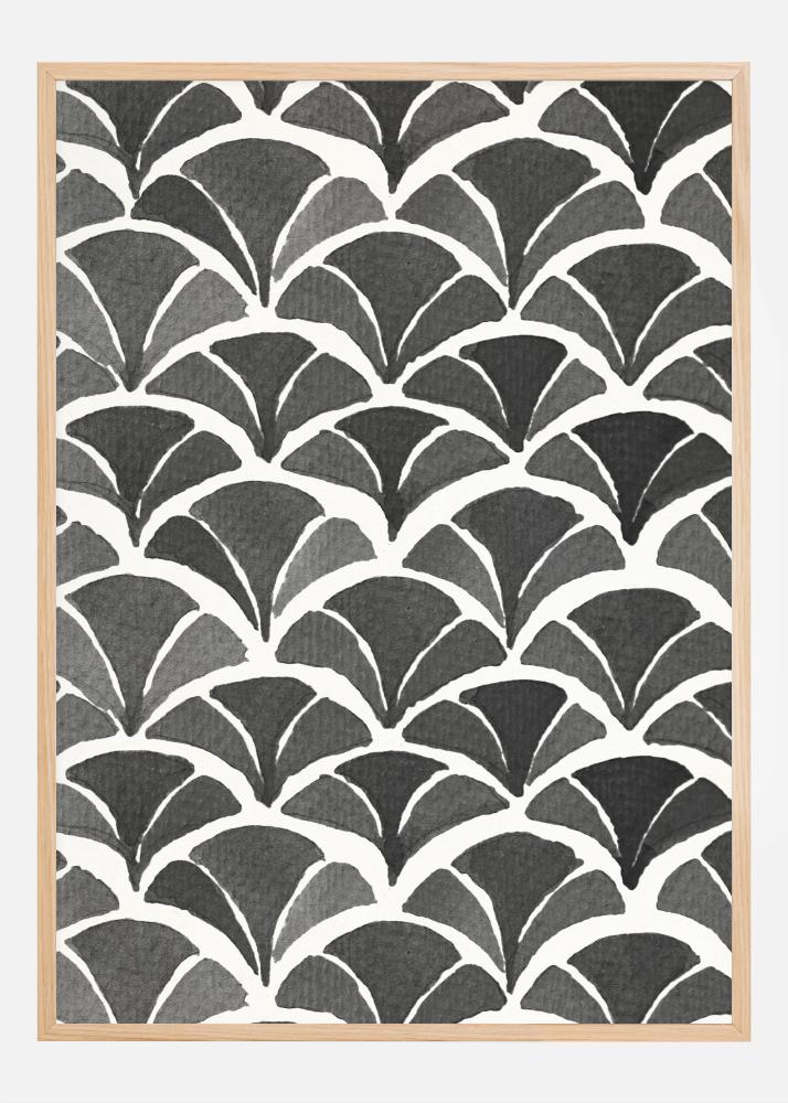 Dodejte svému prostoru dotek umělecké elegance s tímto plakátem, který má poutavý vzor listových peří v černé a bílé barvě. Tento tisk má opakující se vzor, který připomíná vintage ventilátory, uspořádané rytmicky po celé ploše, aby vytvářely pocit pohybu a symetrie. Elegantní kontrast mezi černou a bílou dodává klasický vzhled, který se hodí do mnoha různých interiérových stylů a prostředí.