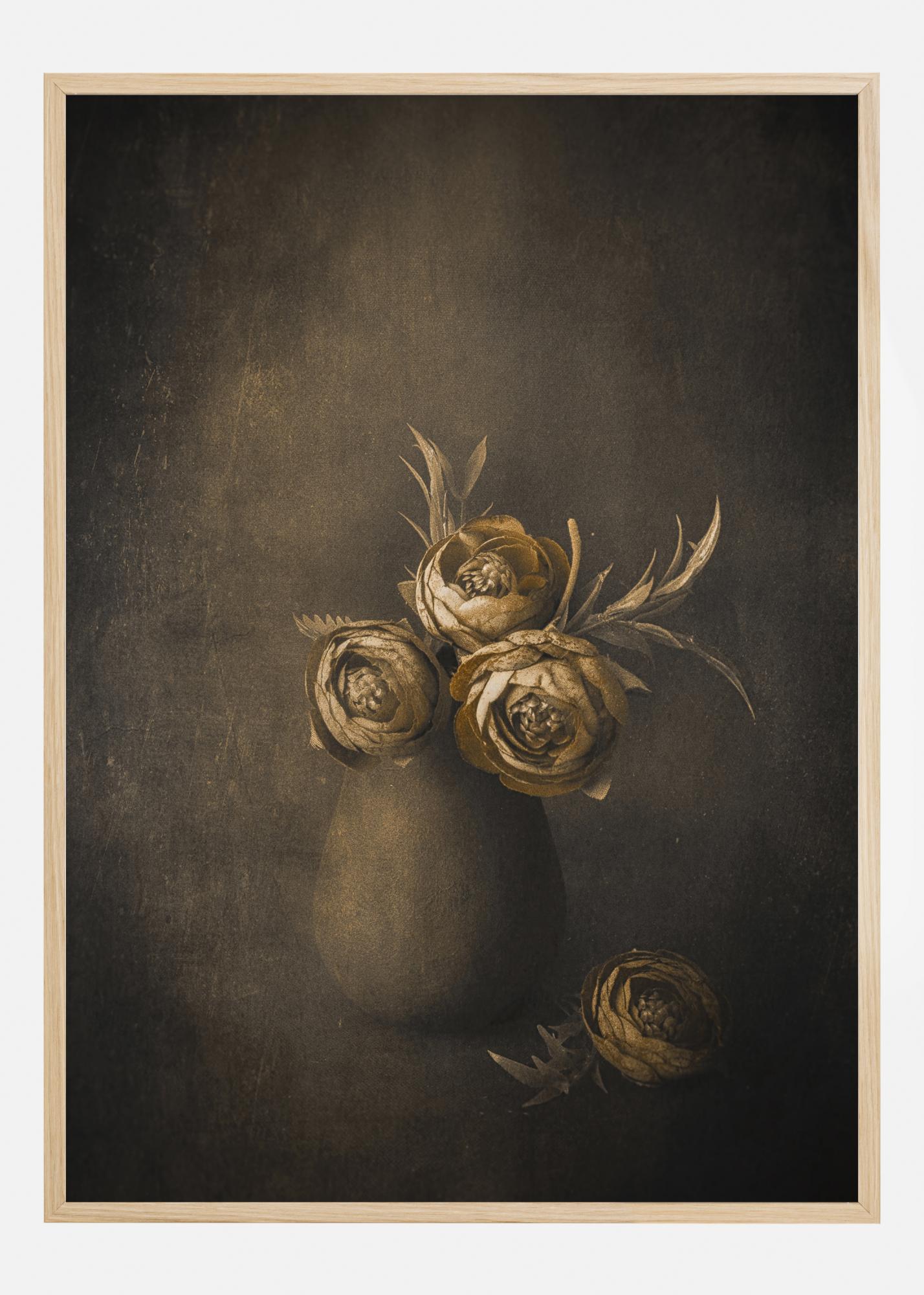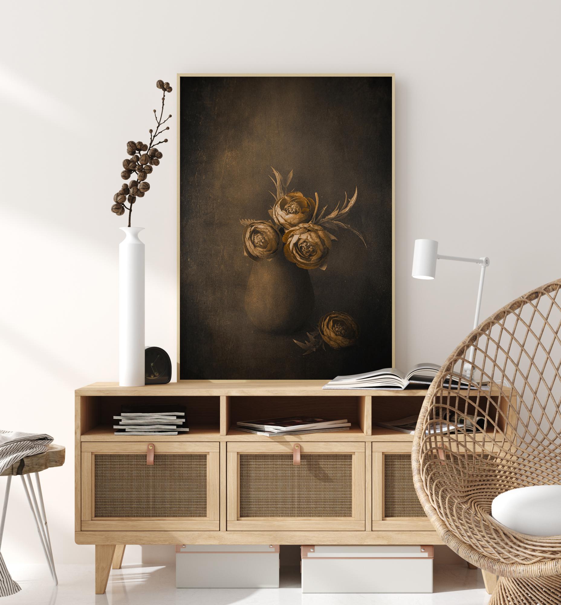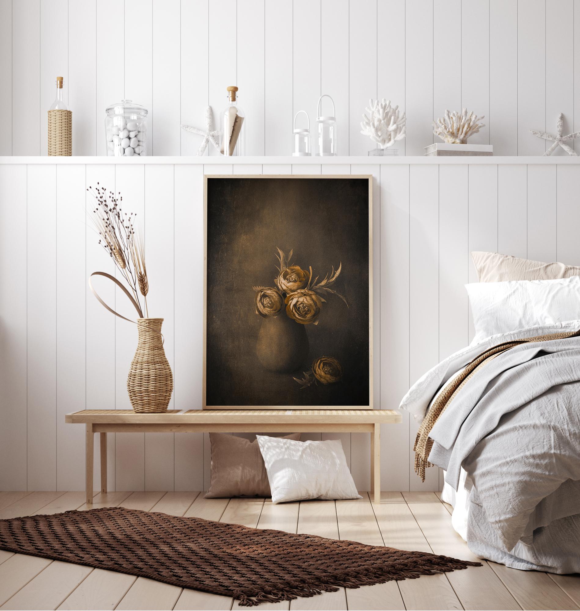 Zátiší s květy ve zlaté barvě v hliněné nádobě na tmavém pozadí. Lesklé zlatožluté květy vynikají proti tmavší hnědé stěně na malbě. Kombinujte se stěnou krémové barvy, abyste květy povýšili na další úroveň.