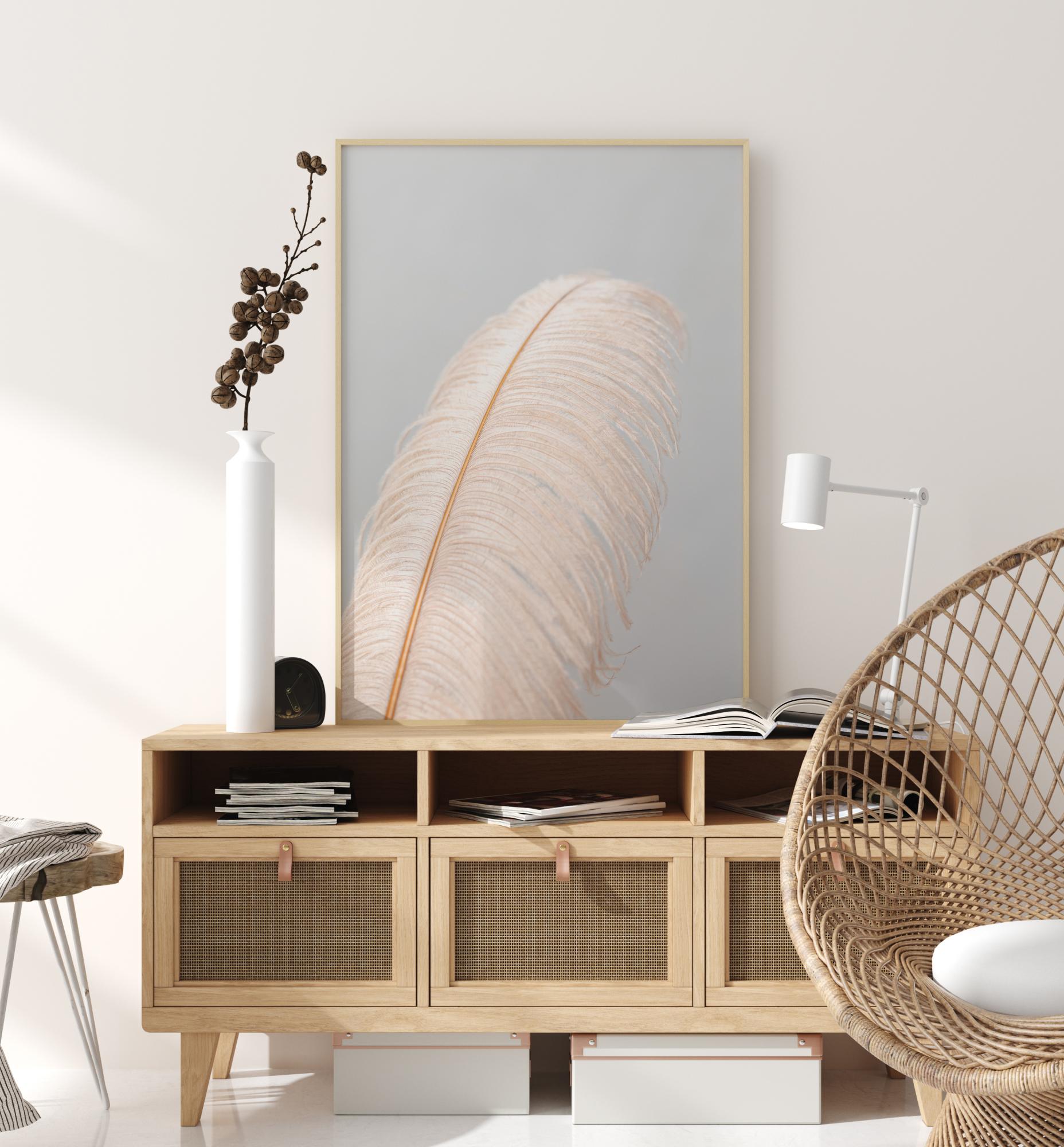 Blízký snímek plakátu s velkým pštrosím peřím. Měkké bílé paprsky proudí na každou stranu růžového centrálního stonku peří. Peří je na pozadí holubí modré barvy, což této fotografii dodává poněkud pohádkový nádech. Je to perfektní doplněk do dětského pokoje.