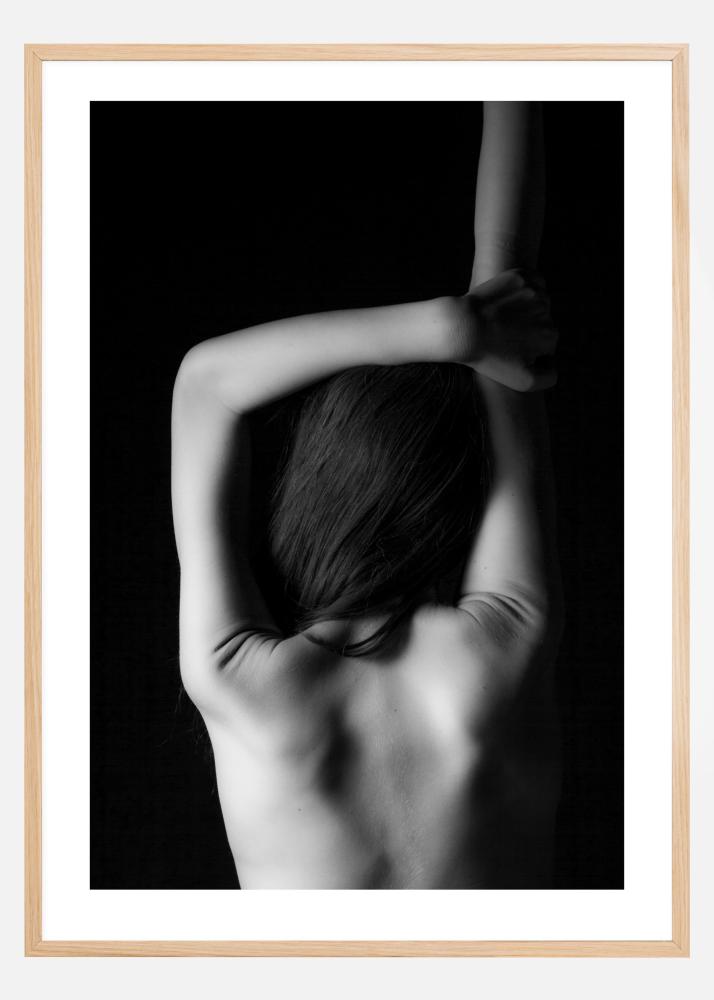 Portrétový plakát se zády ženy. Tento černobílý obrázek zdůrazňuje rovné svaly zad, zatímco zvedá jednu paži vysoko a druhou paži ohýbá přes hlavu. Části jejího těla jsou zahaleny ve stínu. Zavěste toto dílo doma, abyste získali trochu umělecký dojem.