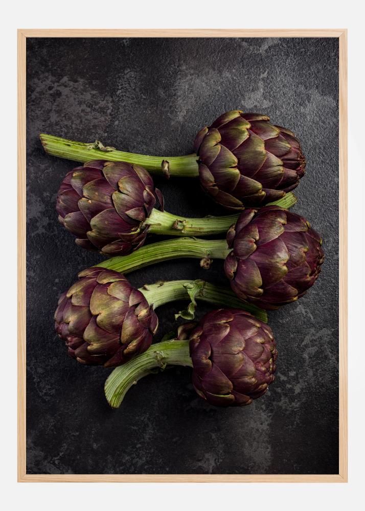 Tento rustikální a přírodou inspirovaný plakát zobrazuje pět artyčoků s bohatými odstíny na tmavém, texturovaném pozadí. Detailní fotografie zdůrazňuje tmavě zelené a purpurově červené odstíny v listech artyčoků a tento zemní motiv by se dobře hodil do kuchyně nebo jídelny, kde může inspirovat k kulinářským dobrodružstvím. Tento tisk je nejen poctou kráse přírody, ale také připomínkou schopnosti čerstvého jídla spojovat lidi.