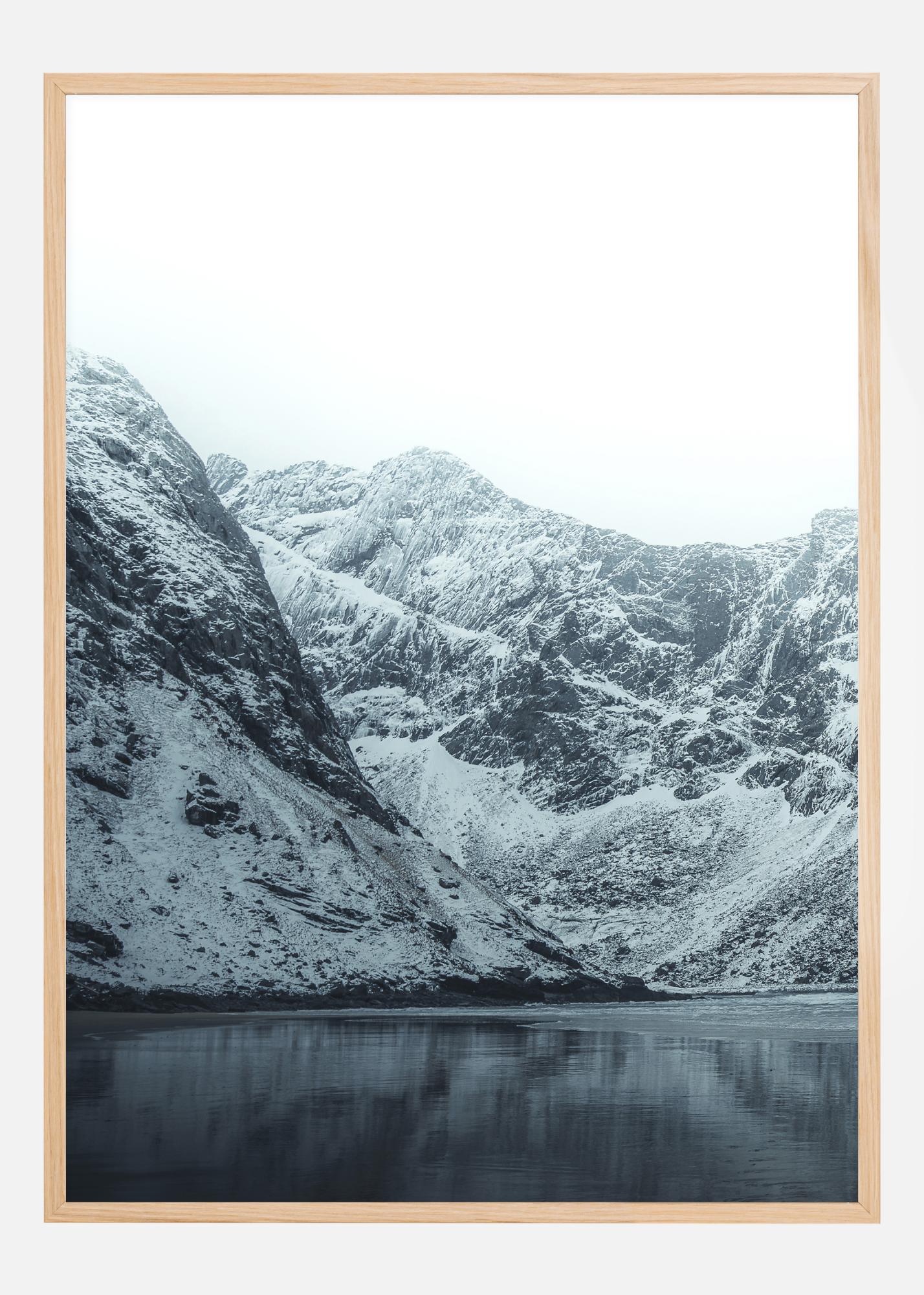 Dramatický plakát se zasněženými horami vedoucími dolů ke klidné vodě. Jezero nebo možná fjord se táhne směrem ke zasněženým horám a setkává se s nimi v popředí. Světlá bílá obloha pomáhá vytvořit pocit zimy. Přineste chladné počasí domů, když pověsíte tento obrázek.