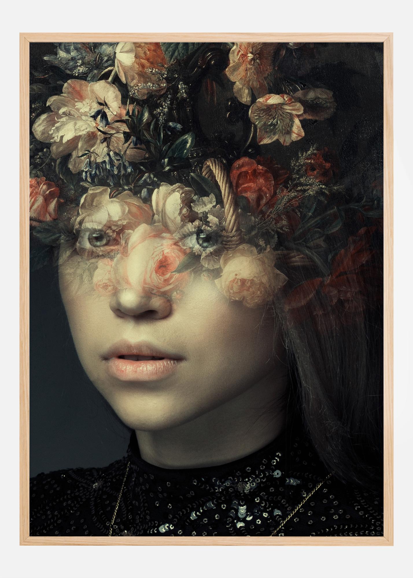 Tento okouzlující plakát spojuje krásu lidského portrétu s nedotčenou estetikou přírody. Dílo zobrazuje ženu, jejíž tvář je částečně zakrytá bohatým květinovým aranžmá, což vyvolává tajemný a téměř snový efekt. Toto umělecké dílo s kvetoucím věncem a jemnou, naturalistickou barevnou paletou vyzařuje nadčasovou eleganci a uměleckou jemnost.