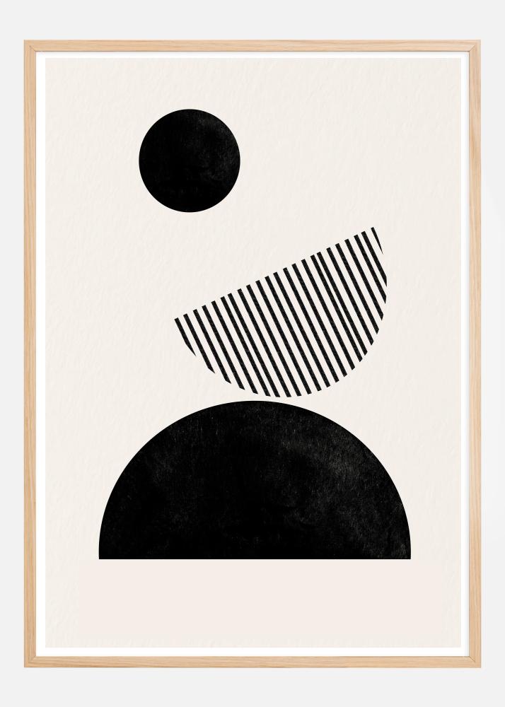 Tento umělecký plakát se vyznačuje hravým použitím geometrických tvarů a textur k vytvoření vyvážené a moderní kompozice. Velký černý kruh je umístěn nahoře, následuje diagonálně vroubkovaná polokružnice a pevný černý polokruhový tvar na základně. Každý prvek přispívá k pocitu pohybu a dynamiky, zatímco jednotné barevné schéma vytváří pocit souvislosti a jednoduchosti.