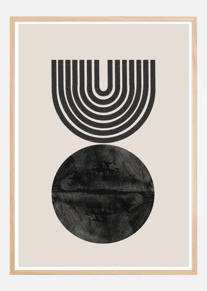 Tento umělecký plakát zaujme oko svým odvážným kontrastem a fascinující kompozicí geometrických a organických tvarů. Nahoře se objevuje série černých linií, které vytvářejí půlkruhový tvar, což poskytuje silnou vizuální strukturu proti klidnému, neutrálnímu pozadí. Dole vidíme texturovaný černý kruh připomínající odrazy ve vodě, což dodává designu hloubku a tajemnou kvalitu. Vybrané barvy v černé a off-white vytvářejí nadčasovou paletu, která oslovuje širokou škálu chutí a stylů interiéru.