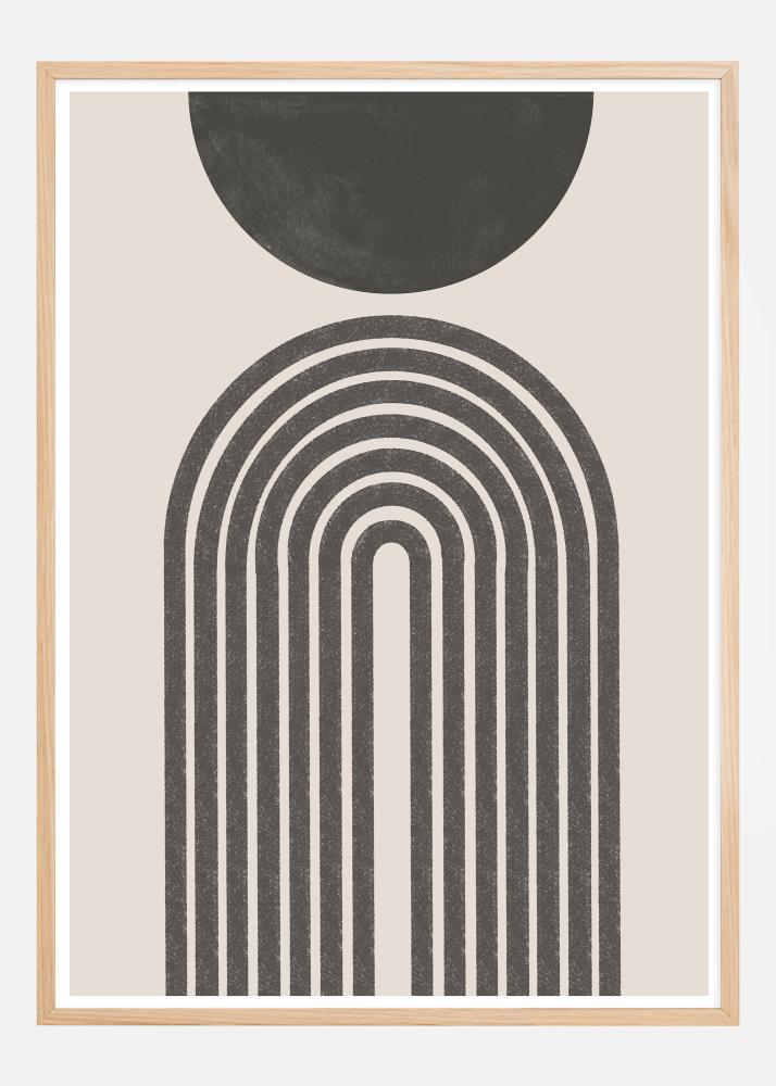 Tento umělecký plakát ukazuje spojení geometrické přesnosti a organické jemnosti. Horní část designu tvoří černý půlkruh, který vyzařuje uklidňující přítomnost na teplém, neutrálním pozadí. Pod tímto se zvedá řada černých oblouků, které harmonicky tvoří portálovitý tvar, čímž vytvářejí kontrast mezi striktní geometrií a abstraktními křivkami černého kruhu. Jednoduché barevné schéma s černou na off-white pozadí dodává moderní a elegantní dojem, ideální pro moderní domov nebo kancelář.