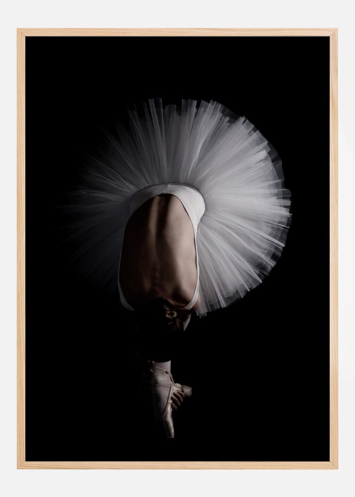 Dramatický plakát s leteckým záběrem baletní tanečnice, která se sklání dopředu, aby dosáhla na své boty. Černé pozadí způsobuje, že bílá baletní sukně vystupuje v jasném kruhu kolem ní. Silné linie na zádech vedou oko k elegantně špičatým nohám. Elegance a drama se spojují v tomto jedinečném obraze.