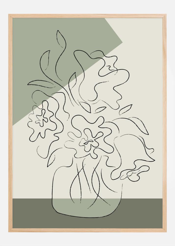 Tento umělecky abstraktní plakát zobrazuje stylizované květinové lístky a listí v elegantní, plynulé linii, která se vznáší nad dvoubarevným pozadím jemných zelených a neutrálních tónů. Jednoduchá krása designu, zdůrazněná jemnou texturou, která přináší organický pocit, vytváří uvolněnou a klidnou atmosféru. Tento moderní a elegantní tisk by dokonale zapadl do minimalistického nebo skandinávského inspirovaného domova a dodal by dotek klidu přírody, aniž by zahltil místnost přílišnou barvou nebo složitostí.