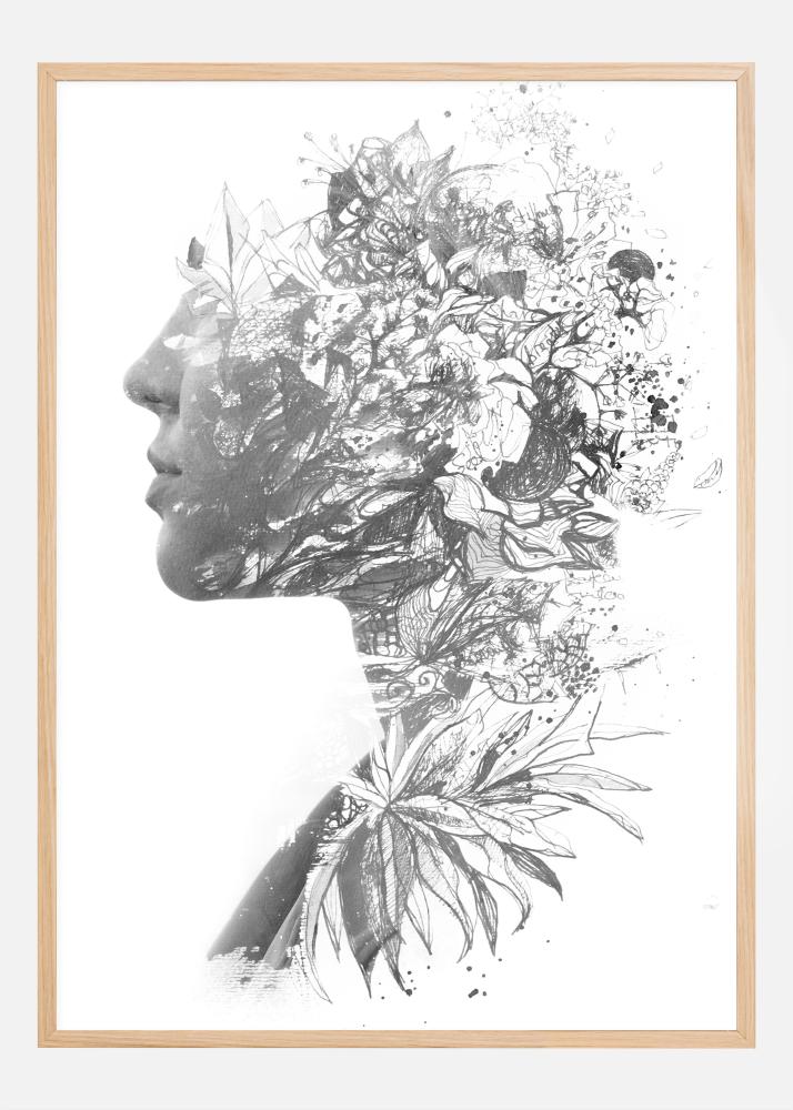 Tento umělecký plakát kombinuje profil ženy s detailní a složitou ilustrací květin a rostlin, čímž vytváří fascinující spojení lidské postavy a jemných detailů přírody. Černobílá barevná schéma dává nadčasový pocit a zdůrazňuje jemnou texturu a složitost jak lidské postavy, tak květinových motivů.