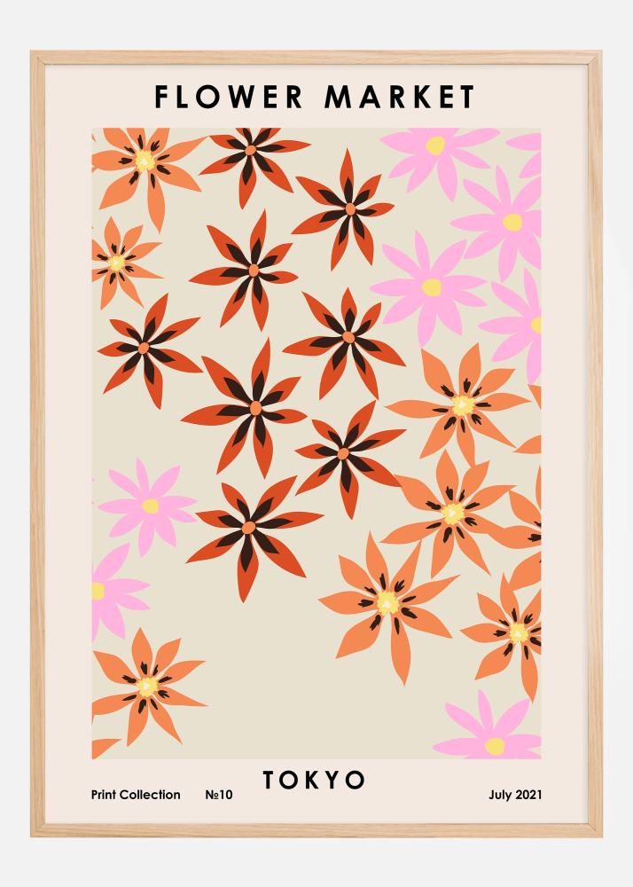 Tento živý plakát zachycuje esenci květinového trhu v Tokiu svým kypícím vzorem květin v korálové, černé a růžové na světlém béžovém pozadí. Tento plakát přináší hravý a moderní pocit, který zvelebí každý prostor svou estetickou přitažlivostí. Každá květina je jednoduchá, ale umělecky ztvárněná, s odstíny, které dodávají pocit hloubky a rozměru designu.
