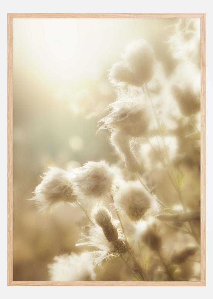 Kouzelný plakát s nadýchanými květinami v časných ranních hodinách. Jemné koule na květinách jsou osvětleny ranním světlem, které vytváří andělské glorioly kolem každé květiny. Jemné pastelové barvy pomáhají vytvořit ospalý, kouzelný pocit jemného probuzení.