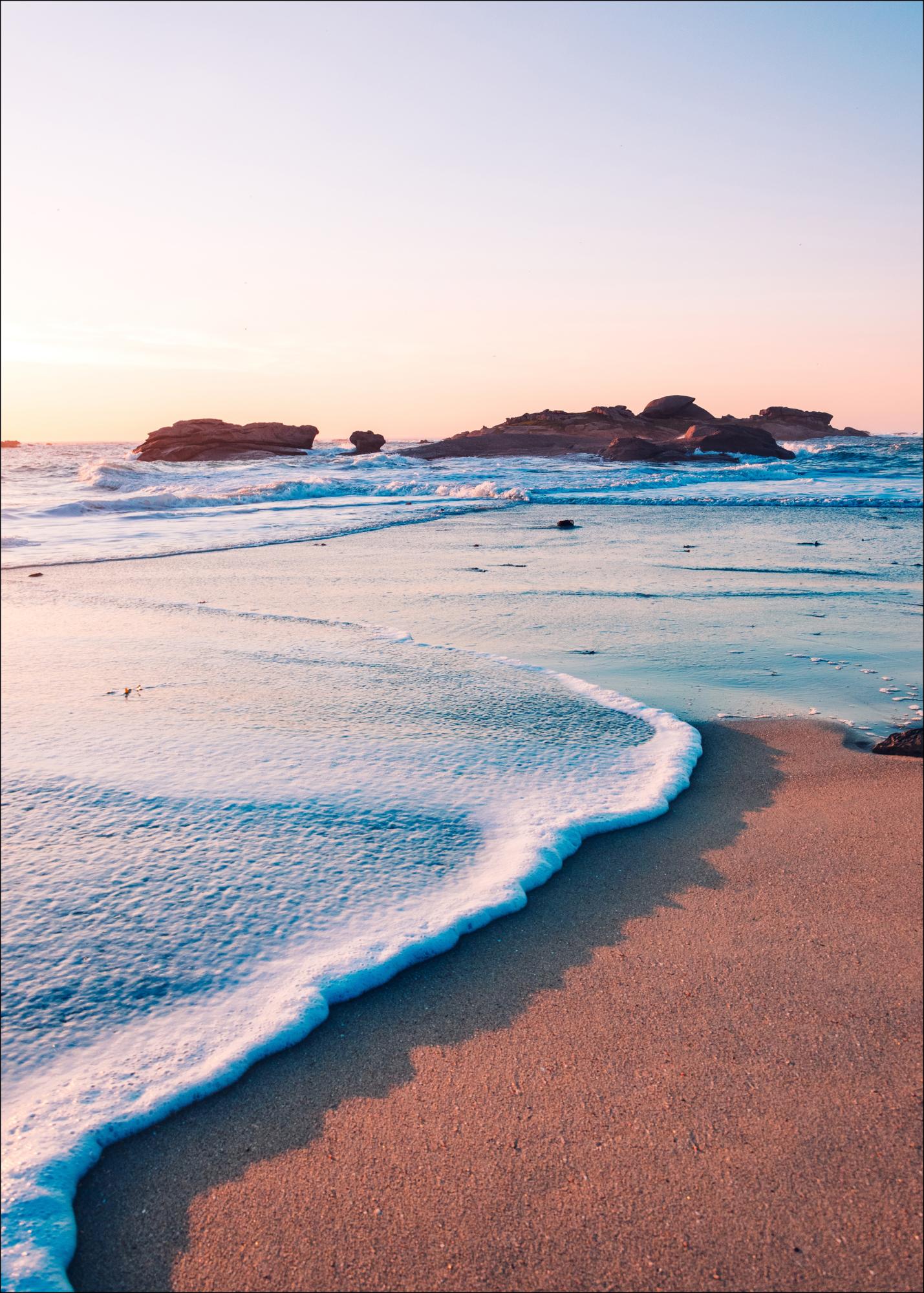 Plakát moře se širokou pláží, kde vlny a moře narážejí na pobřeží. Jemné sluneční světlo vrhá stíny vln na písek a vytváří klidné prostředí, ve kterém si můžete představit sami sebe. Unášejte se svými sny na tomto nádherném plakátu.