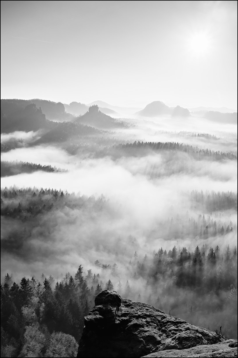 Černobílá fotografie s horskou krajinou pokrytou stromy zahalenou v mlze jako motivem. Hluboká perspektiva na obrázku s výhledem vysoko nad stromy dodává plakátu dramatický pocit. Fotografie se hodí stejně dobře pro zavěšení doma jako na veřejném místě, vynikne ve všech druzích interiérových stylů. Doplňte ji pěkným fotorámečkem, který motiv zvýrazní a bude ladit se zbytkem zařízení v místnosti, kde má být obraz zavěšen.