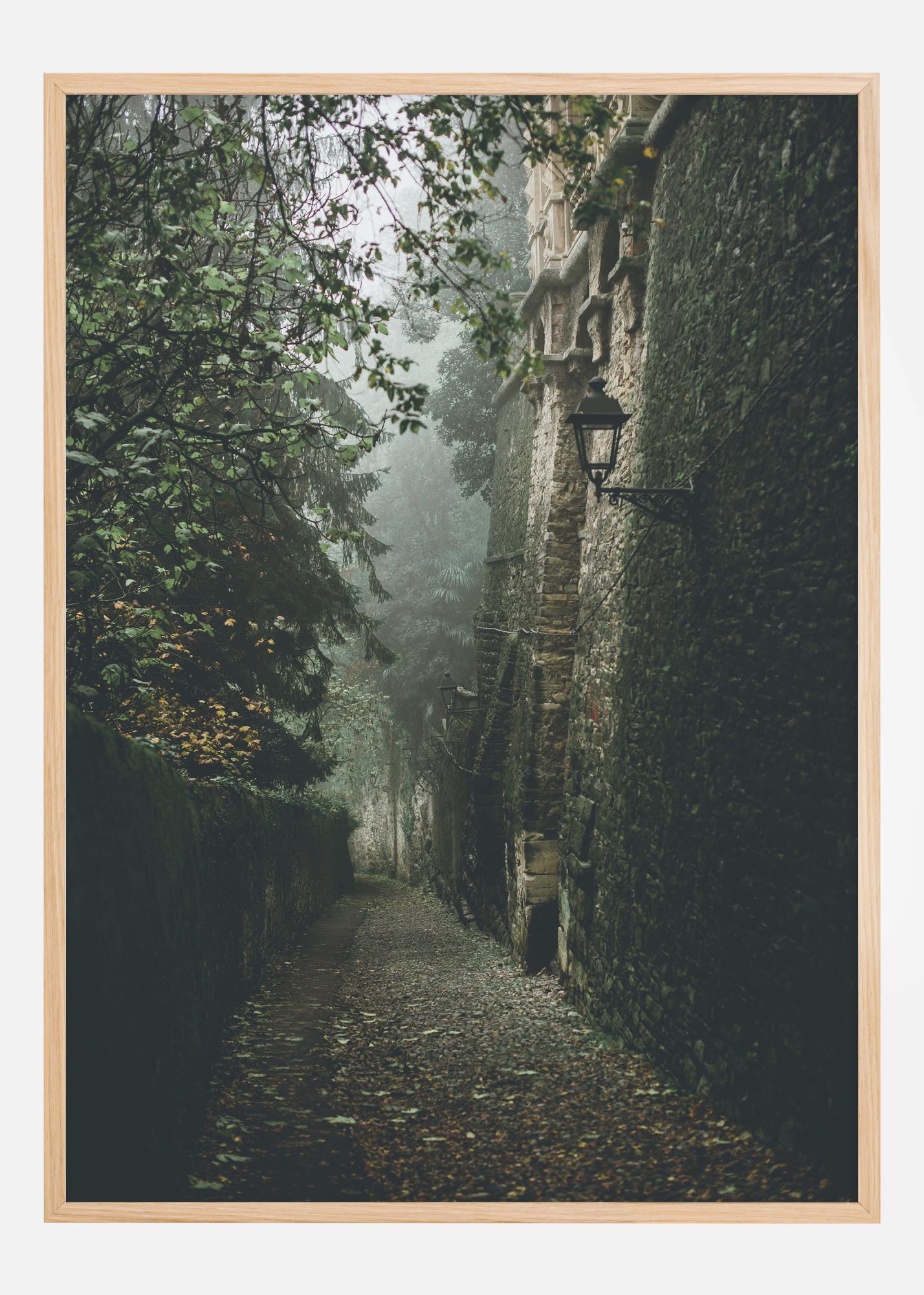 Tento tajemný plakát zachycuje tajuplnou a kouzelnou cestu, zahalenou v mlze a obklopenou zdmi historie. Cesta, lemovaná zdí pokrytou mechem a zavěšeným listím, vyvolává pocit, že jste vkročili přímo do jiného světa. Stará lucerna připevněná na kamenné stavbě budovy zesiluje historický a romantický pocit, který tato obraz přenáší.