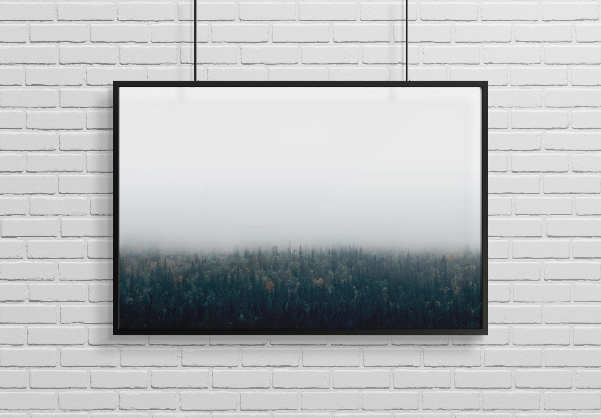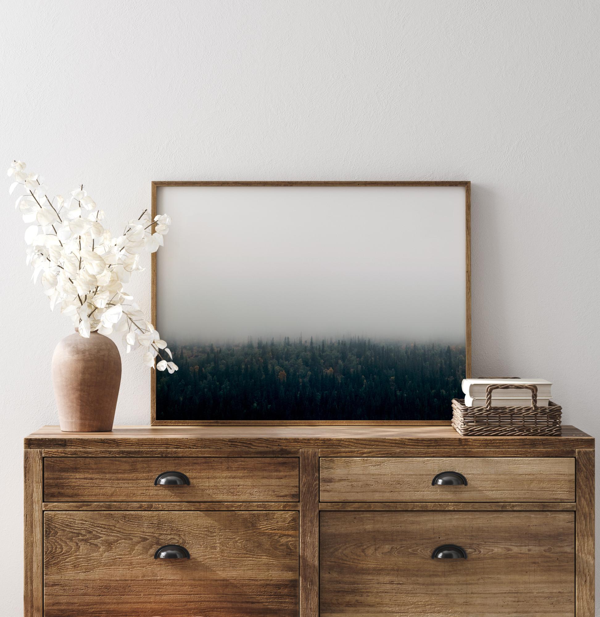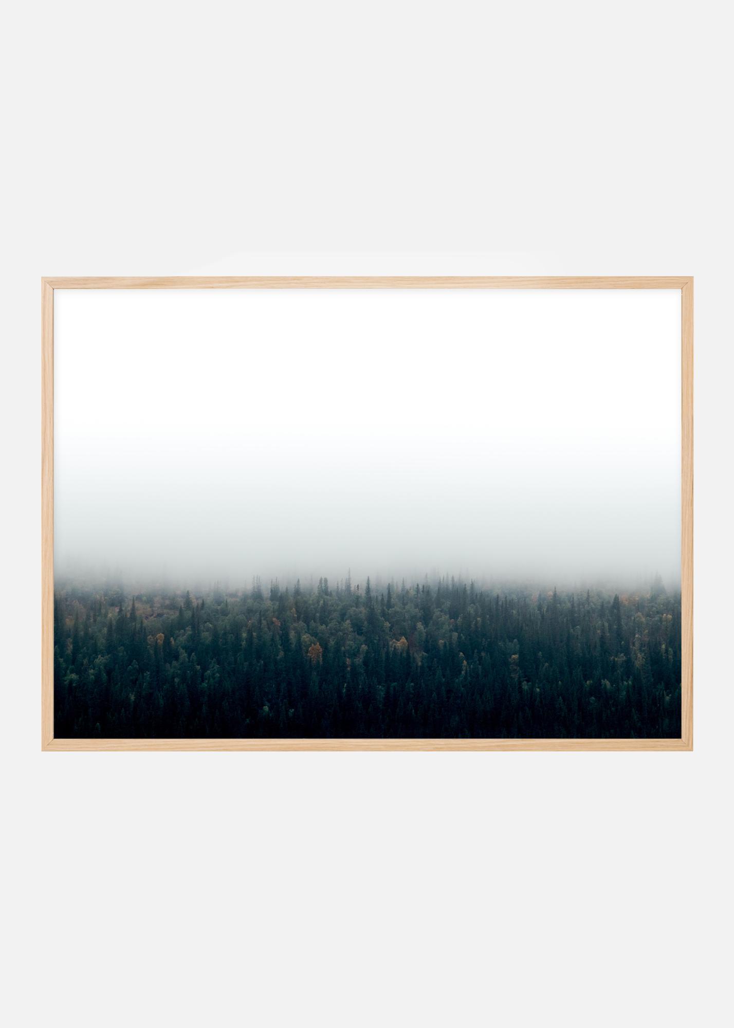 Fotografický plakát rozsáhlého lesa, který odpočívá pod hustou mlhou. Zelené stromy ostře kontrastují s bílou oblohou. Krásný přírodní plakát, který se snadno kombinuje s dalšími oblíbenými kousky. Proč neudělat větší stěnu s tématikou přírody?