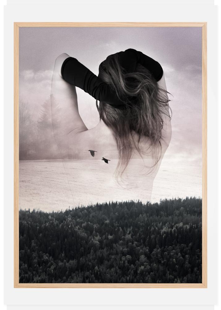 Kolážový plakát s lesem a nebem dole a ženou ve vrstvě přes obrázek. Duše lesa je zde zřejmá, jelikož temný les sahá až k nebi, kde žena s černou rukavicí prohrábne ruku vlasy. Užijte si jinak složený tento skutečně fantazijní obrázek.