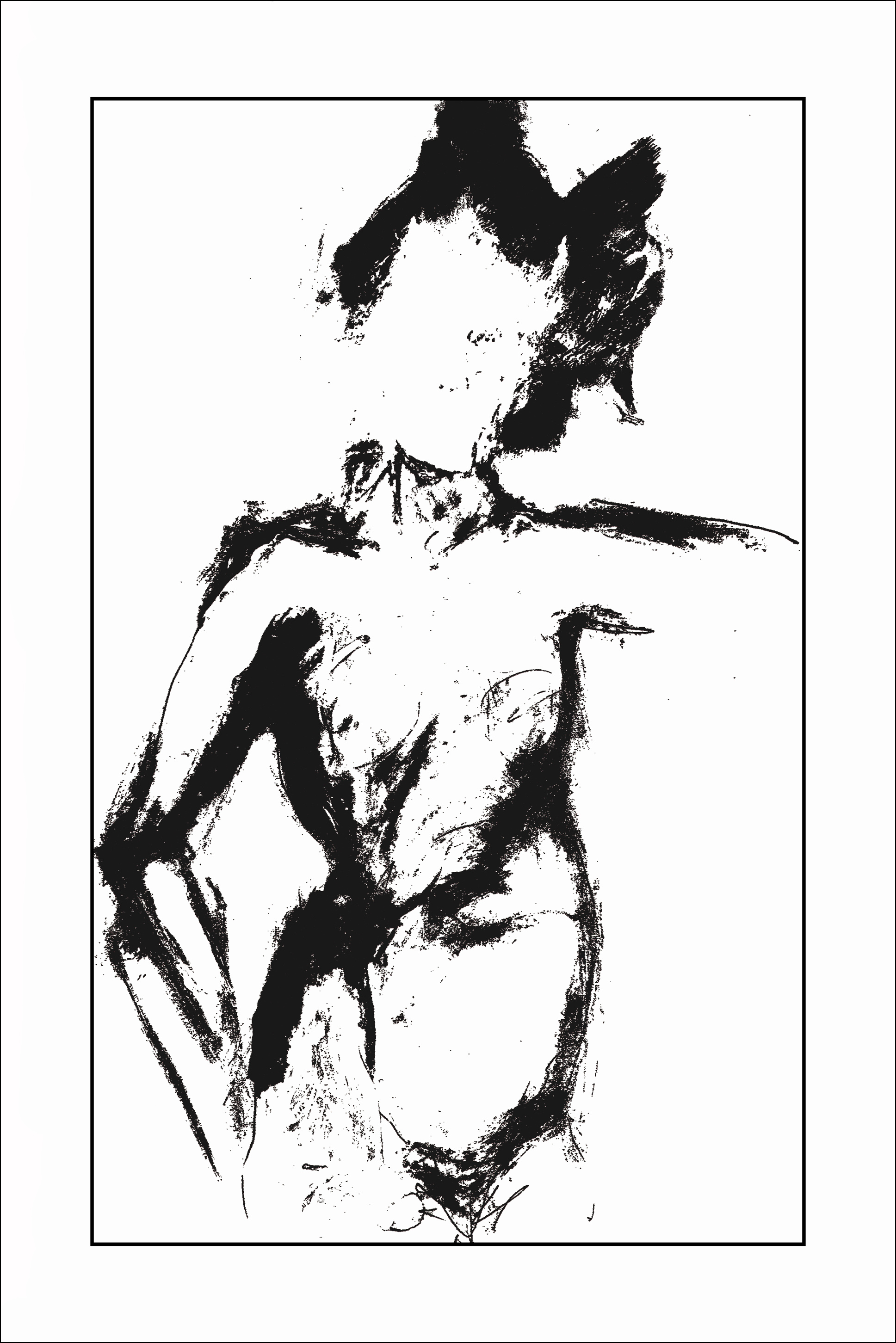 Černobílý plakát s figurálním kreslením. Silné odvážné černé tahy štětcem vytvořily tuto ženu téměř v chiaroscuro stylu. Podívejte se na to chvíli a skoro očekáváte, že se začne hýbat.