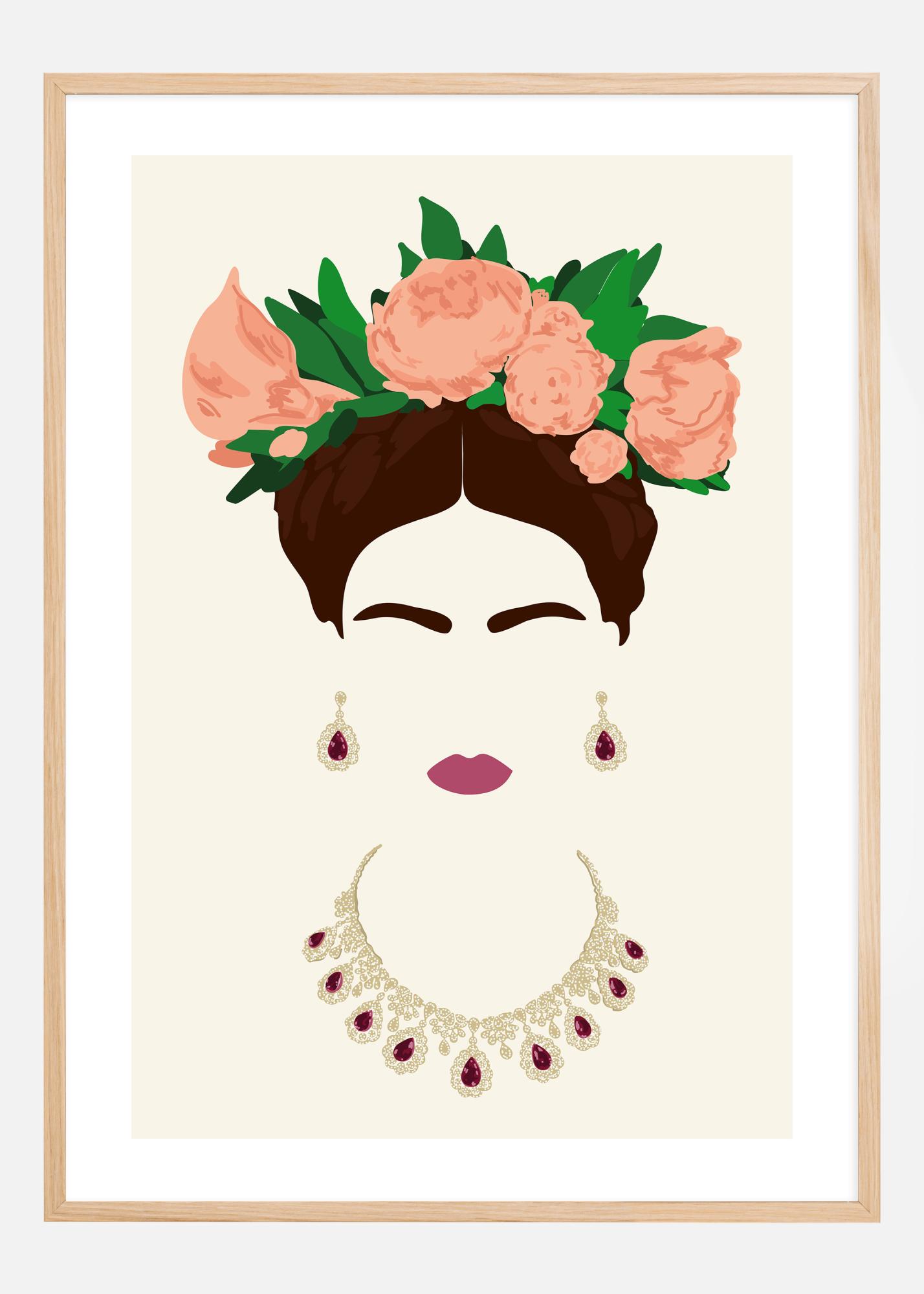 Tento výrazný plakát zobrazuje stylizovanou ženskou postavu zdobenou bohatou florou a elegantními šperky. Motiv představuje harmonické uspořádání tmavě hnědých vlasů, krémové pokožky a zářivé korálově růžové květinové koruny doplněné tmavě zelenými listy. Její rysy obličeje jsou redukovány na minimalistické tvary, což dodává moderní pocit.