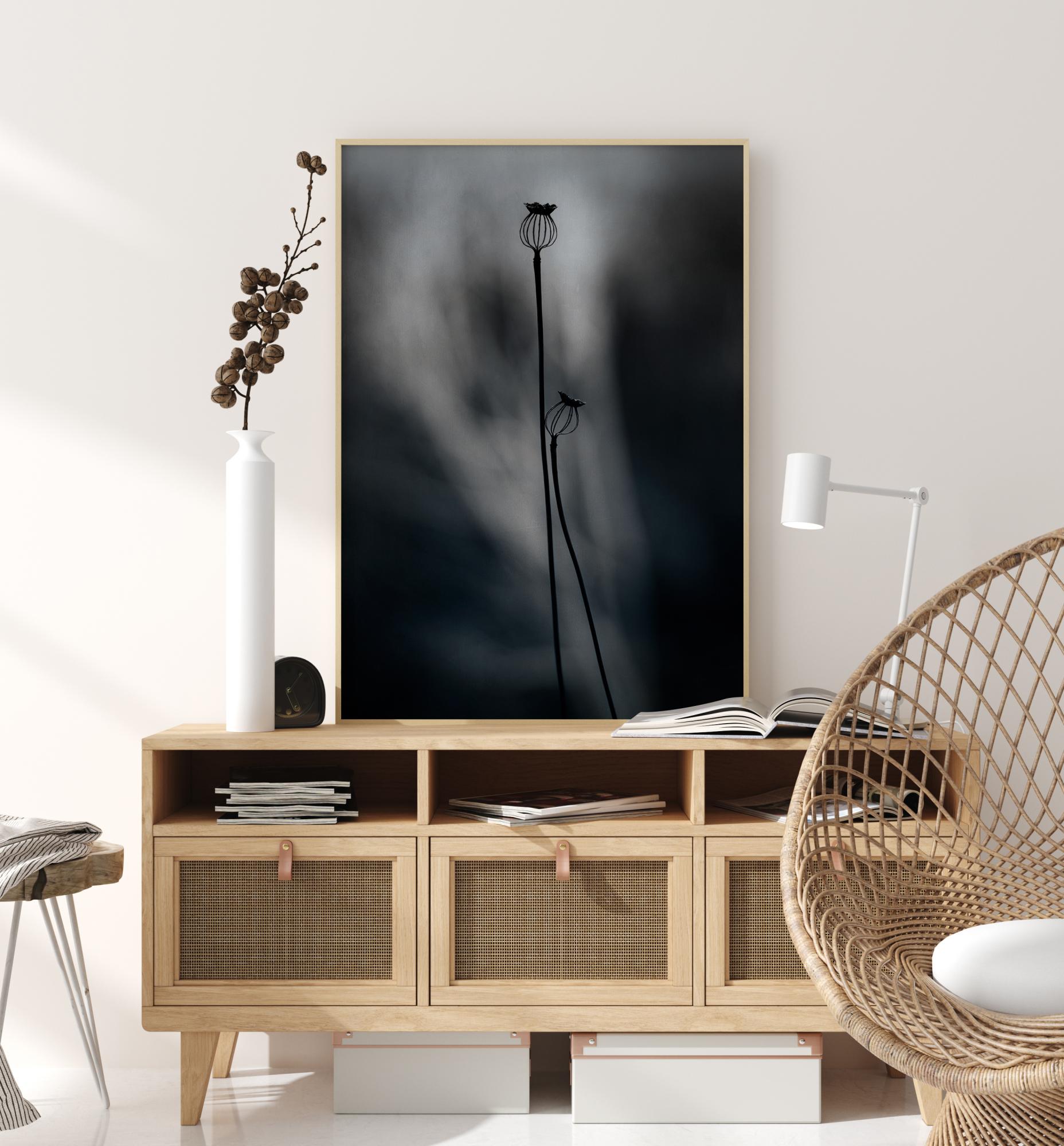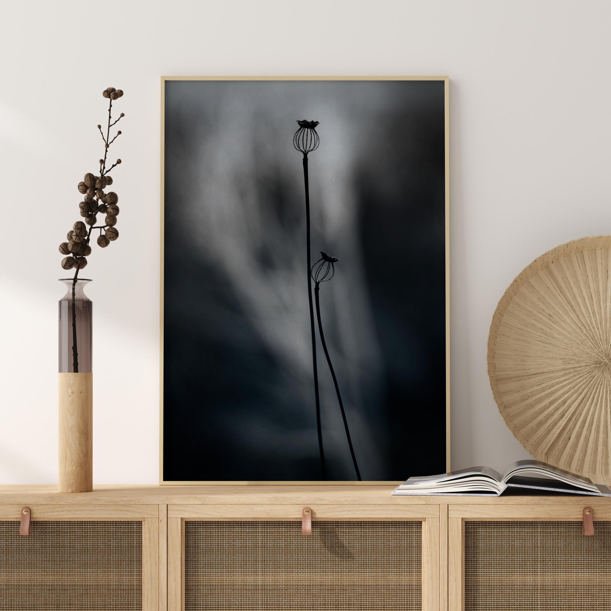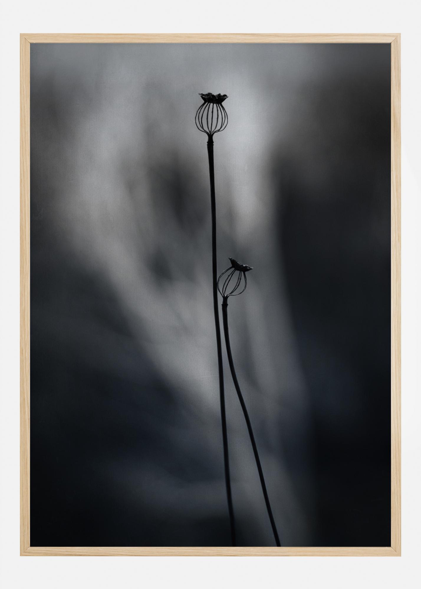 Éterický plakát se dvěma makovými semeny na mírně rozmazaném pozadí. Tento abstraktní obraz vás uchvátí na dlouhé hodiny. Přeneste tuto úžasnou směs klidu a pohybu do svého domova.